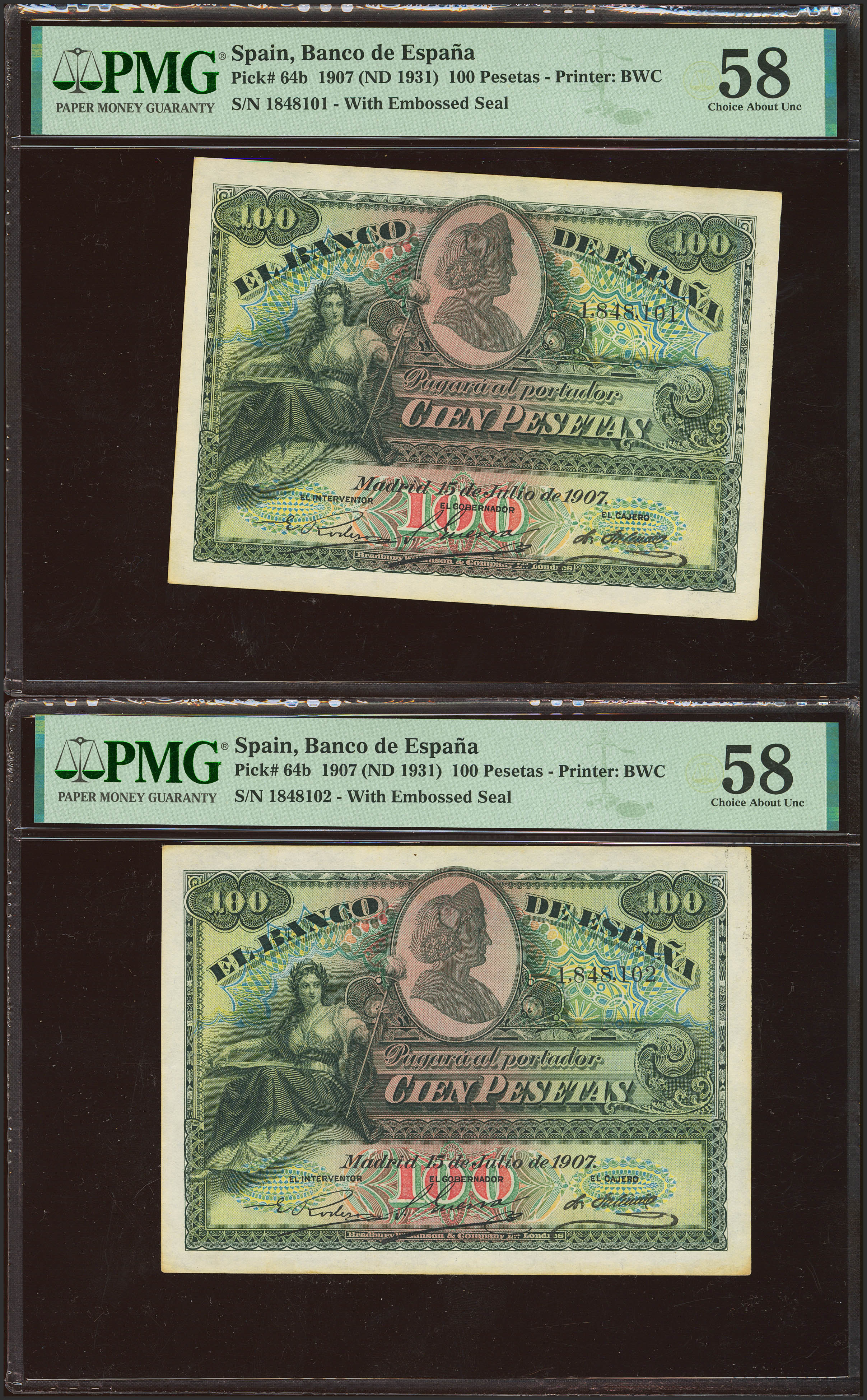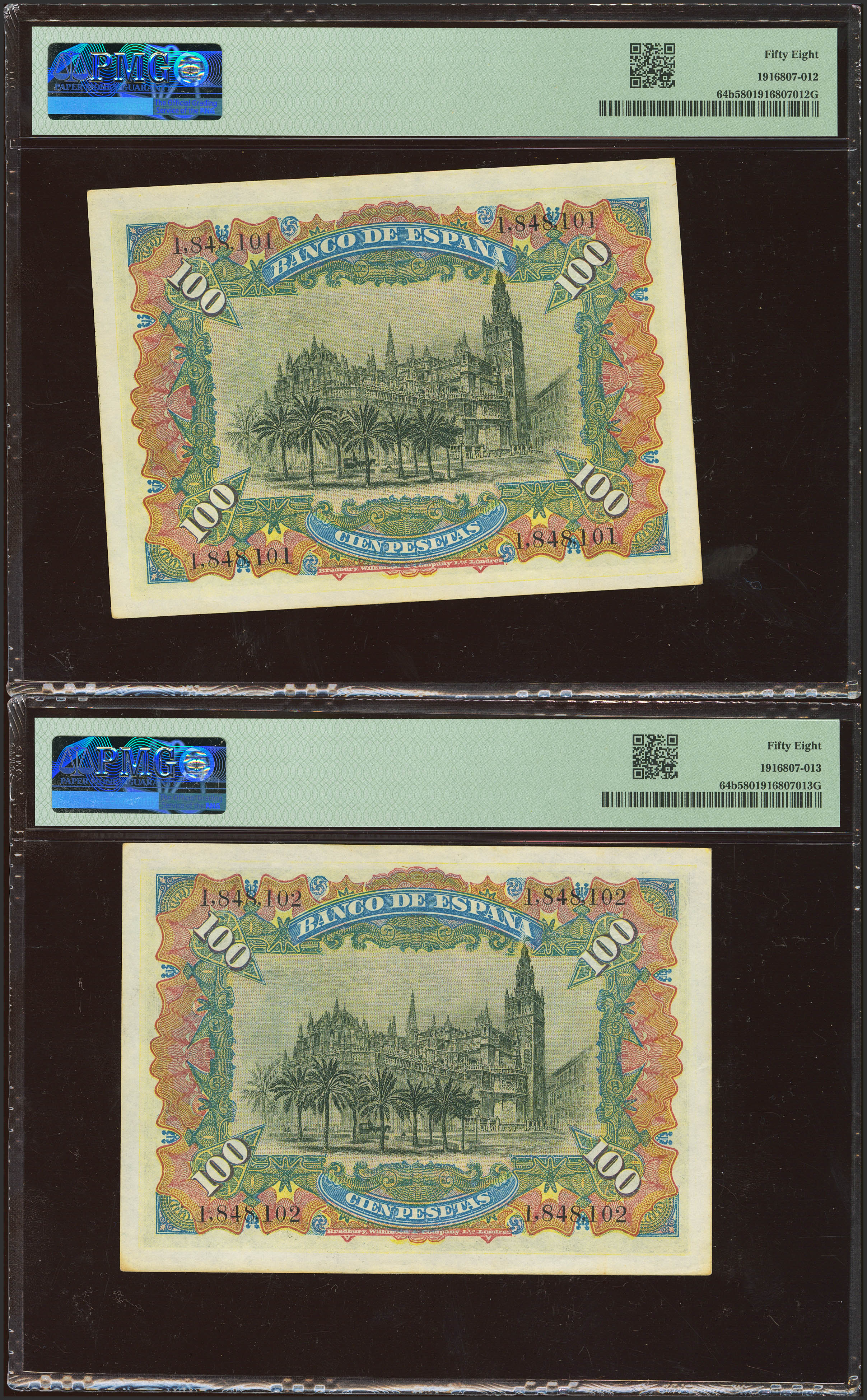 100 Pesetas. 15 de Julio de 1907. Pareja correlativa. Sin serie. (Edifil 2023: 320, Pick: 64a). Inusual en esta calidad. EBC++. Encapsulado PMG58, ambos.