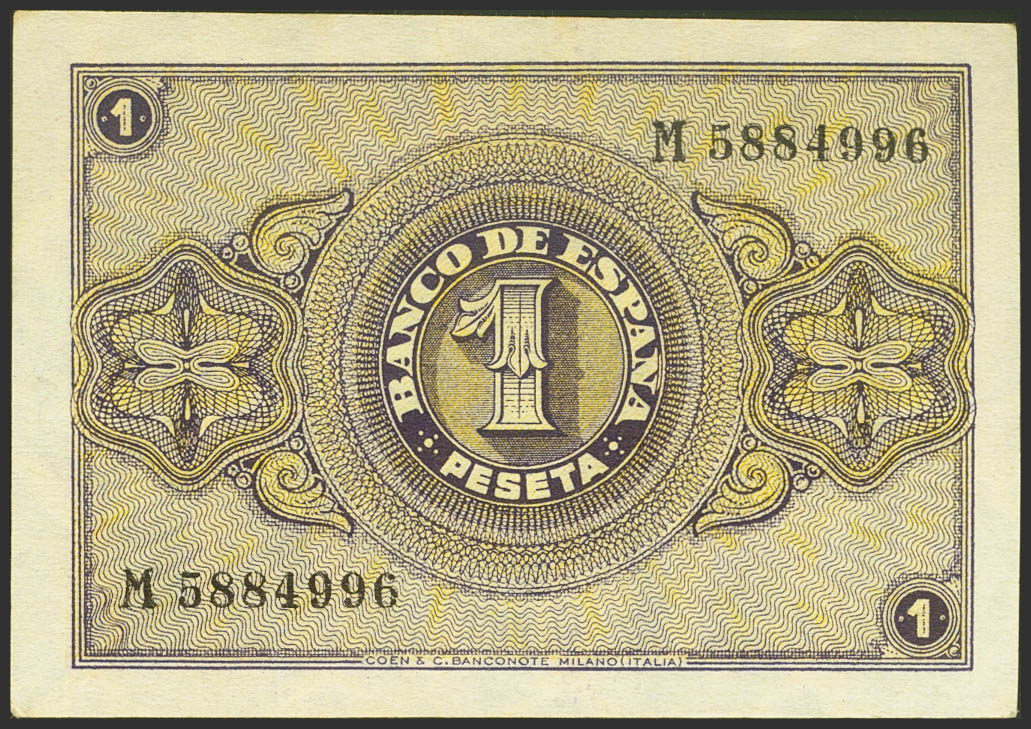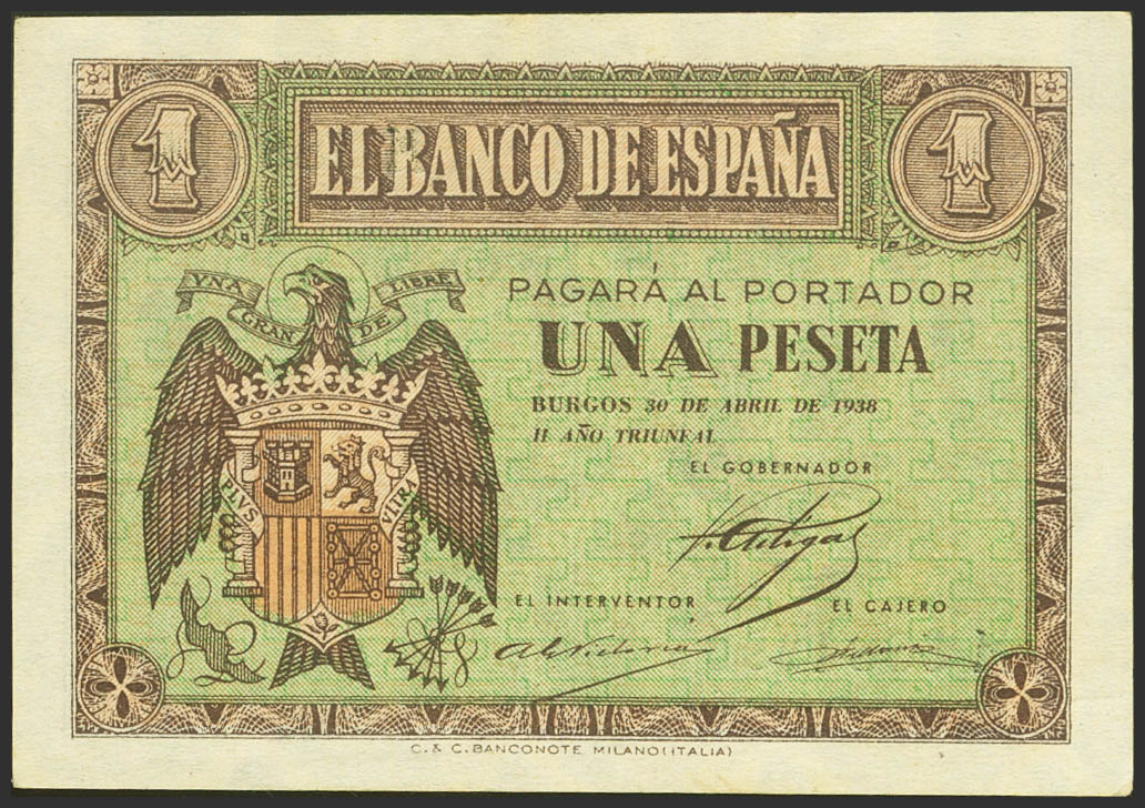 1 Peseta. 30 de Abril de 1938. Serie M. (Edifil 2021: 428a). Apresto original. SC.