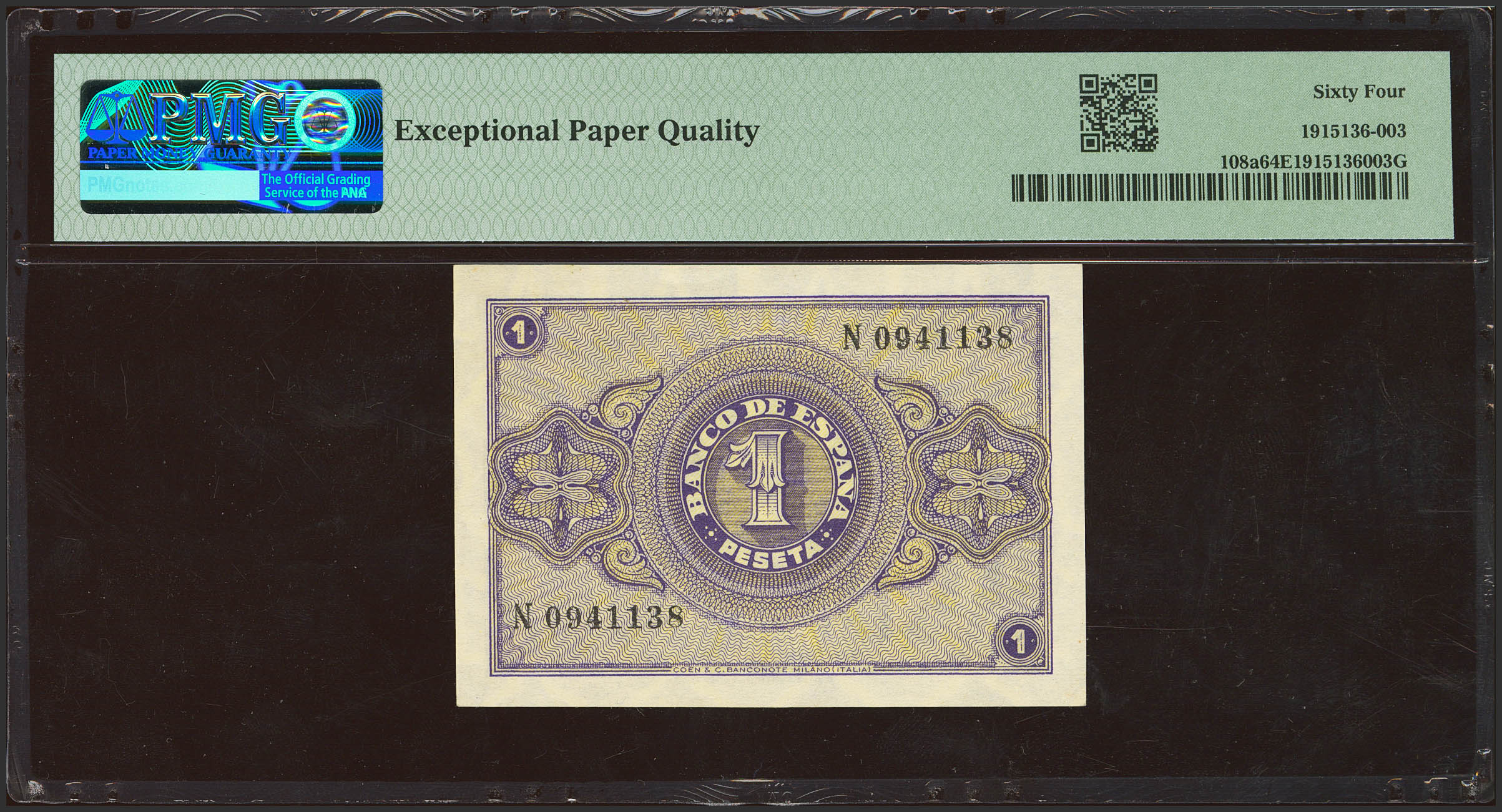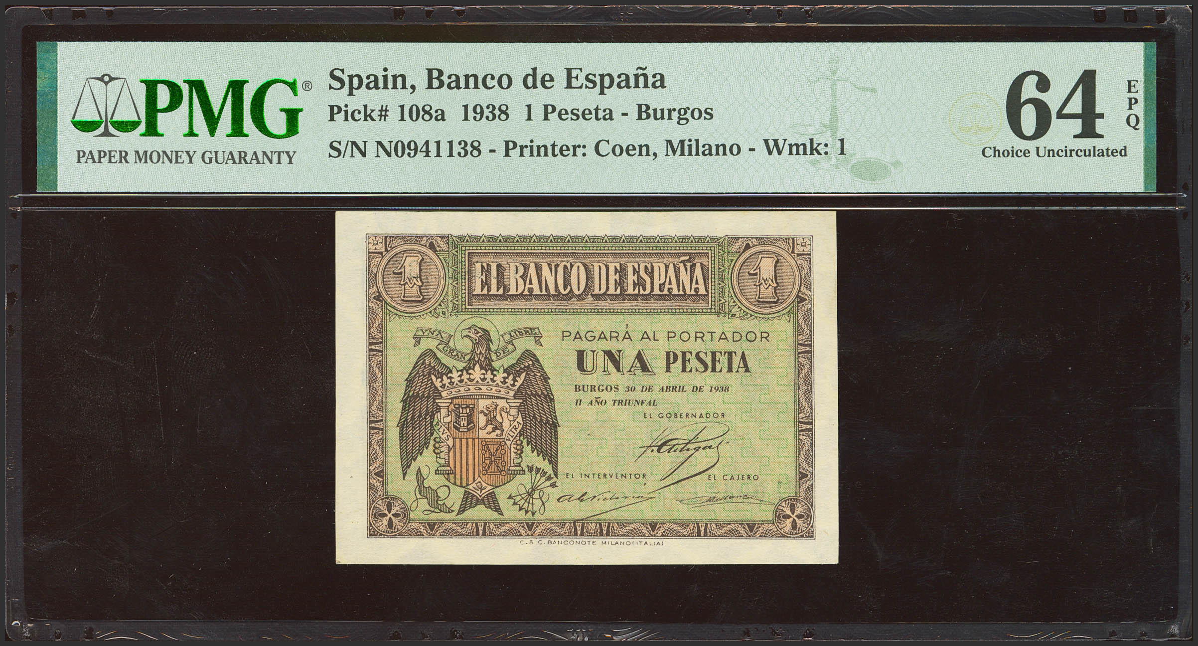 1 Peseta. 30 de Abril de 1938. Serie N, última serie emitida. (Edifil 2023: 428b, Pick: 108a). Apresto original. SC. Encapsulado PMG64EPQ.