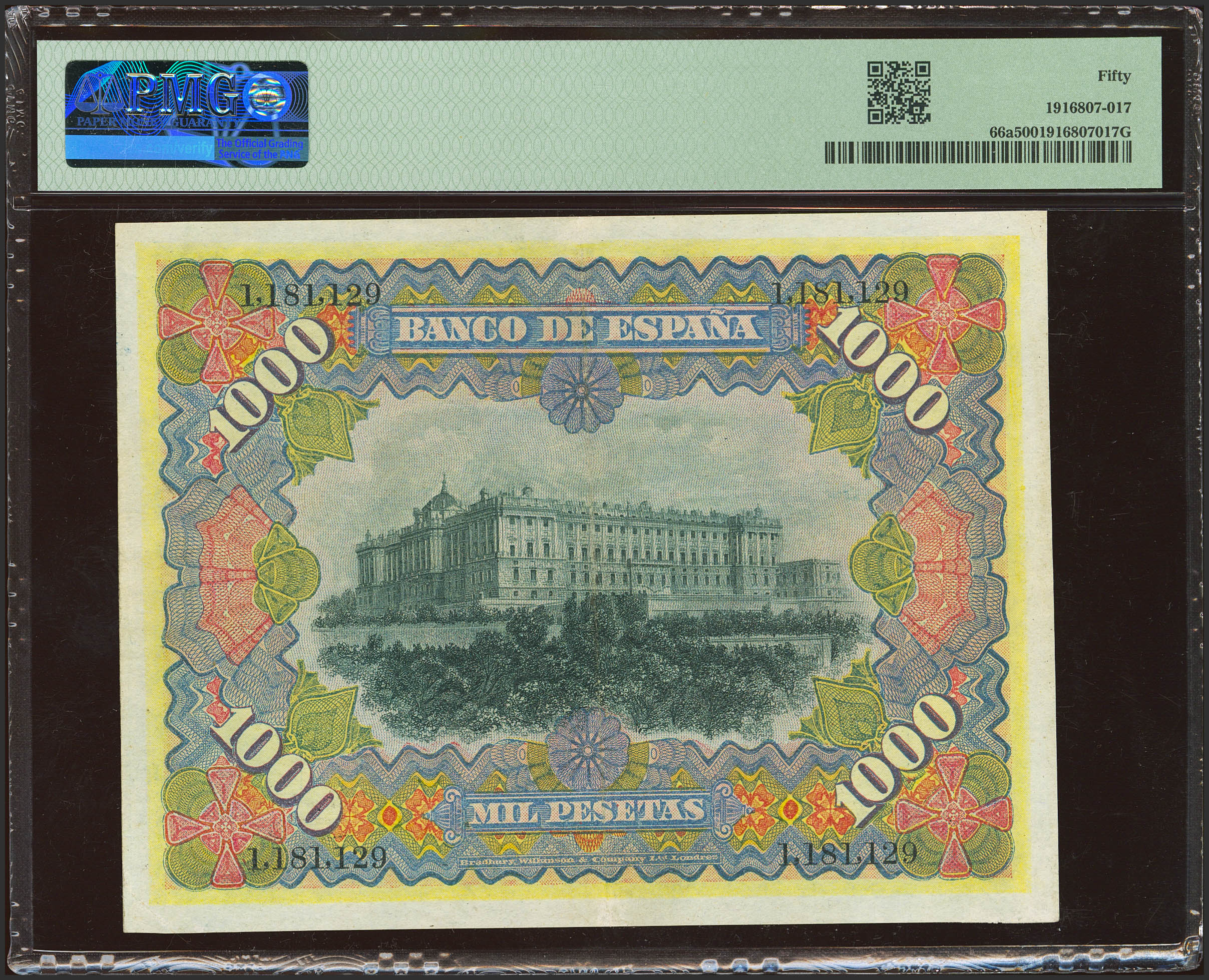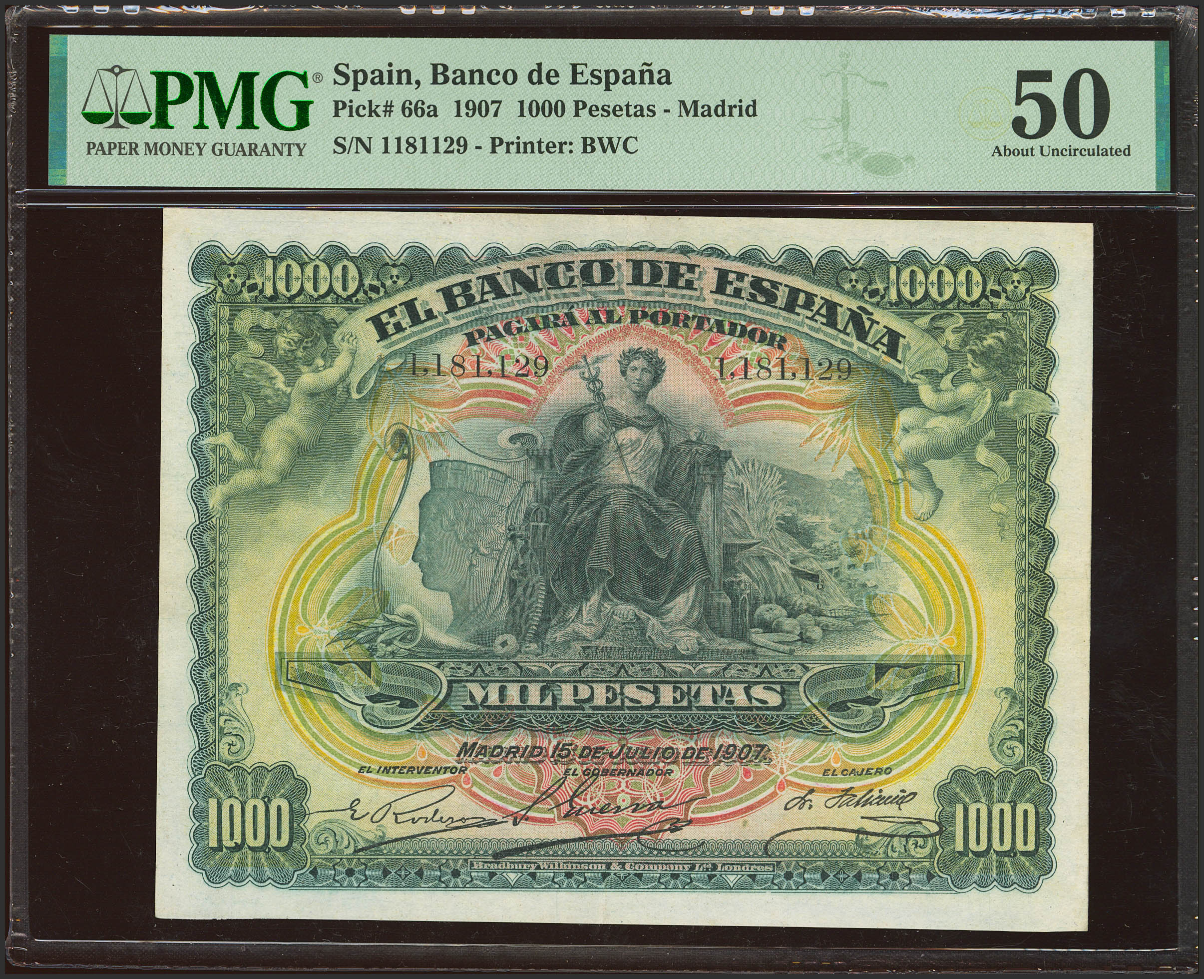 1000 Pesetas. 15 de Julio de 1907. Sin serie. (Edifil 2023: 322, Pick 66a). Rarísimo en esta conservación. EBC. Encapsulado PMG50 (según nuestra opinión se aprecia dos pequeñas reparaciones en los extremos del doblez central, no mencionado en la cápsula).