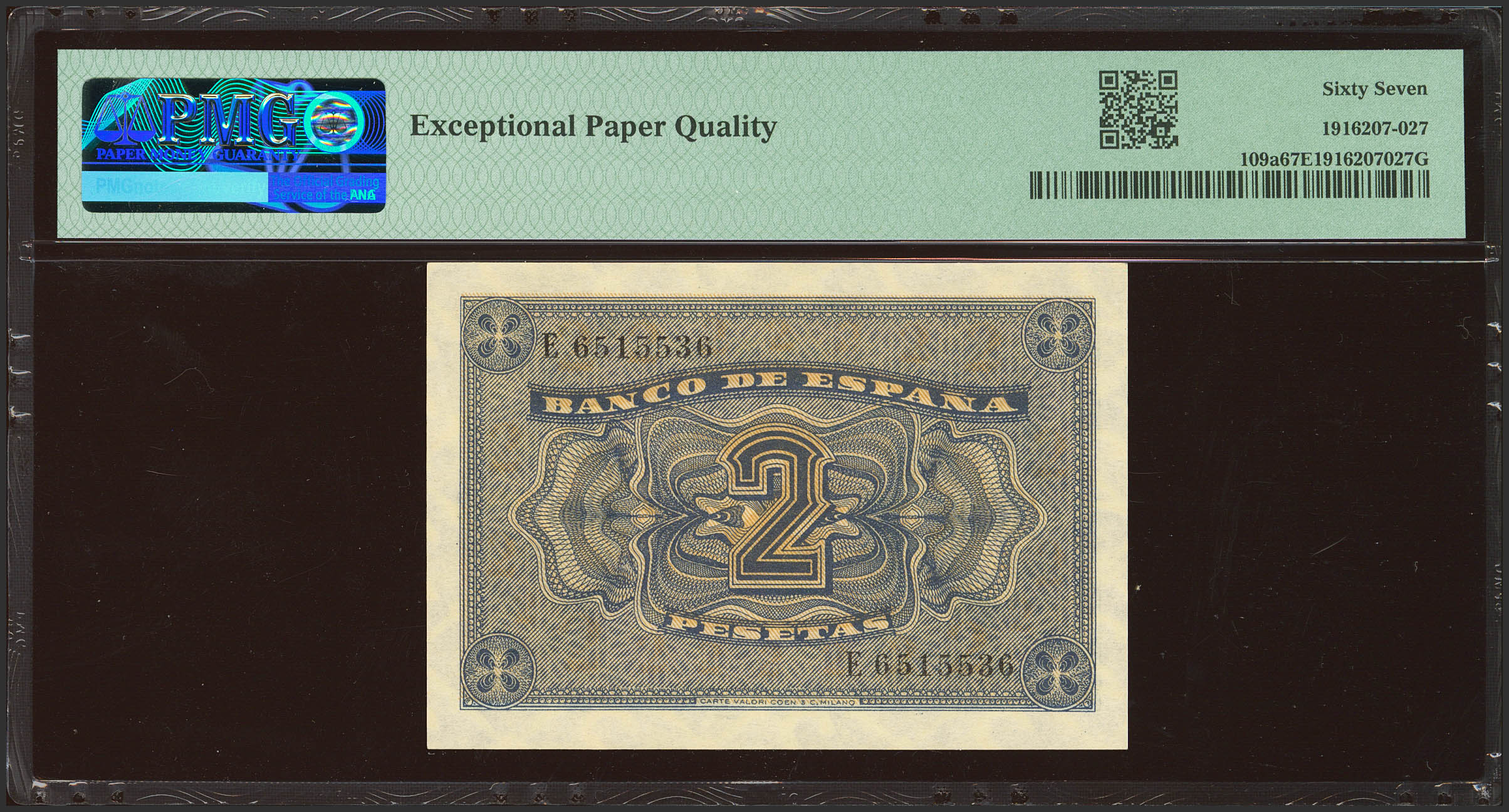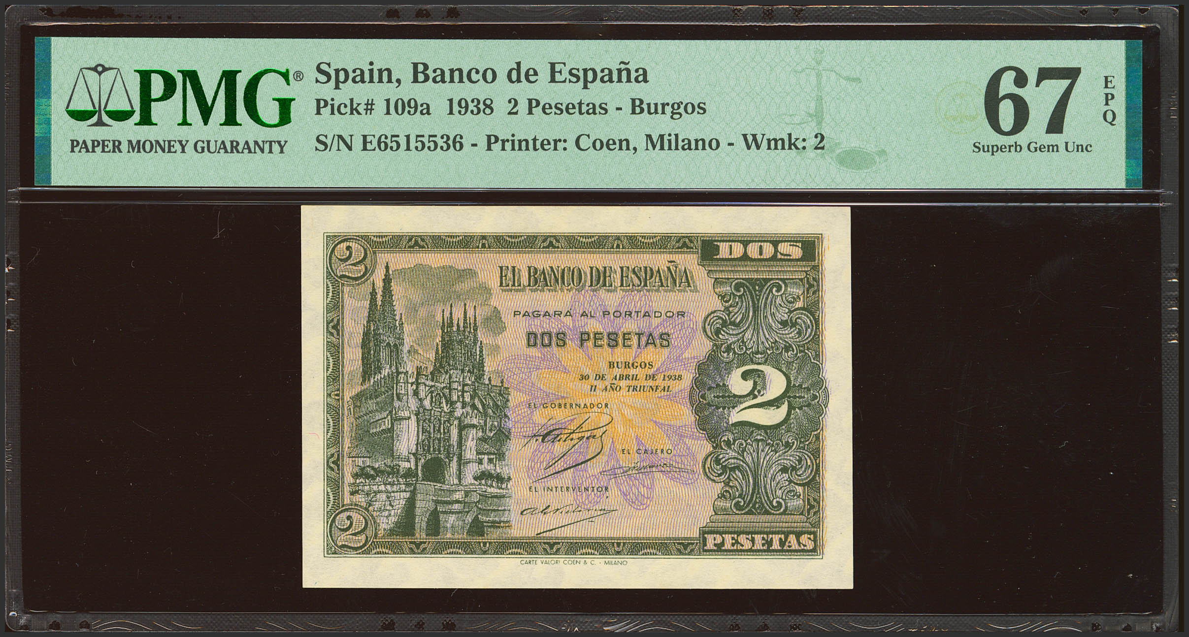 2 Pesetas. 30 de Abril de 1938. Serie E. (Edifil 2023: 429a, Pick: 109a). Raro en esta excepcional calidad, apresto original. SC. Encapsulado PMG67EPQ.