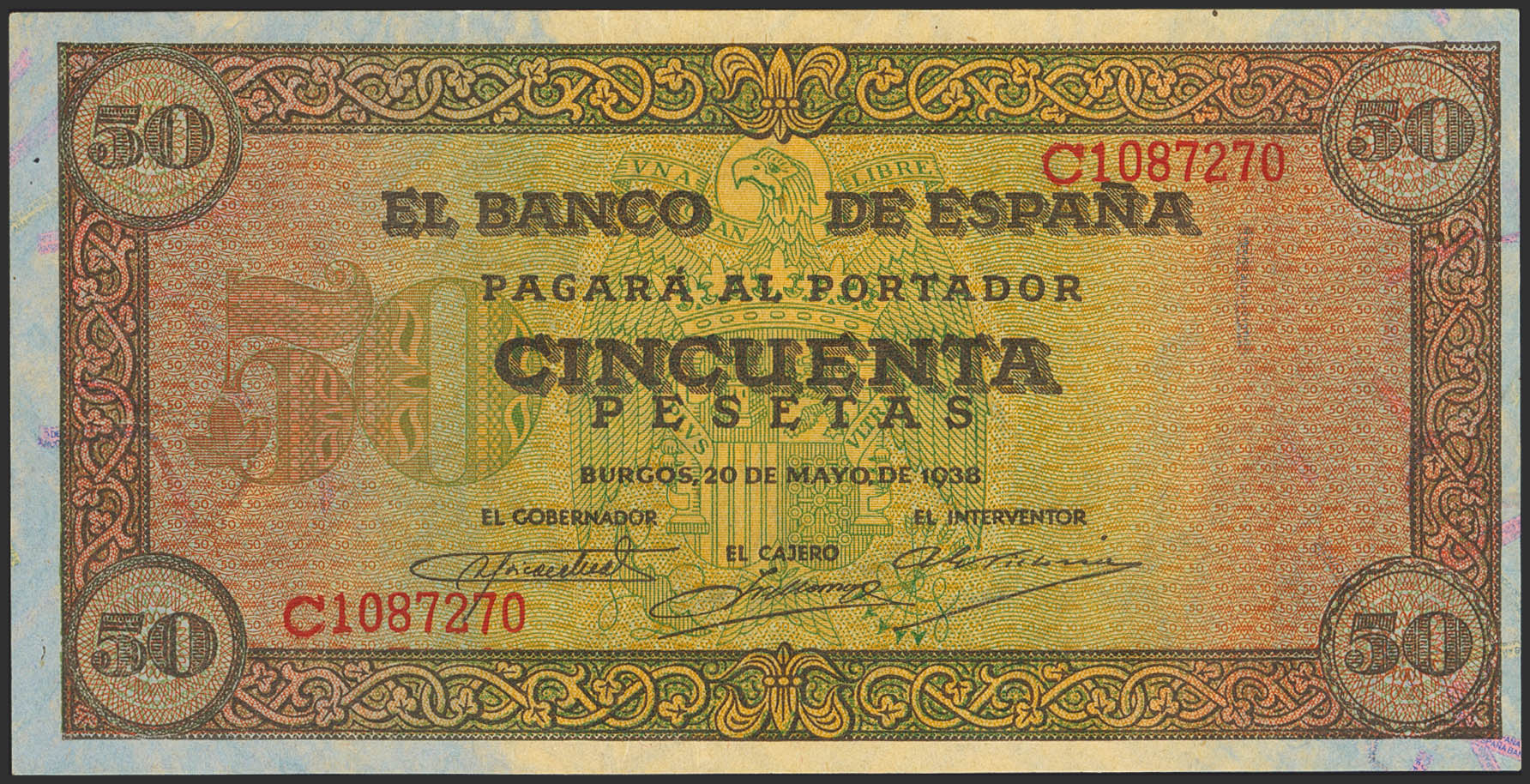 50 Pesetas. 20 de Mayo de 1938. Serie C. (Edifil 2023: 431a). Apresto original, arruguitas naturales del papel (este es el único motivo de "quitarle" el SC). EBC+++.