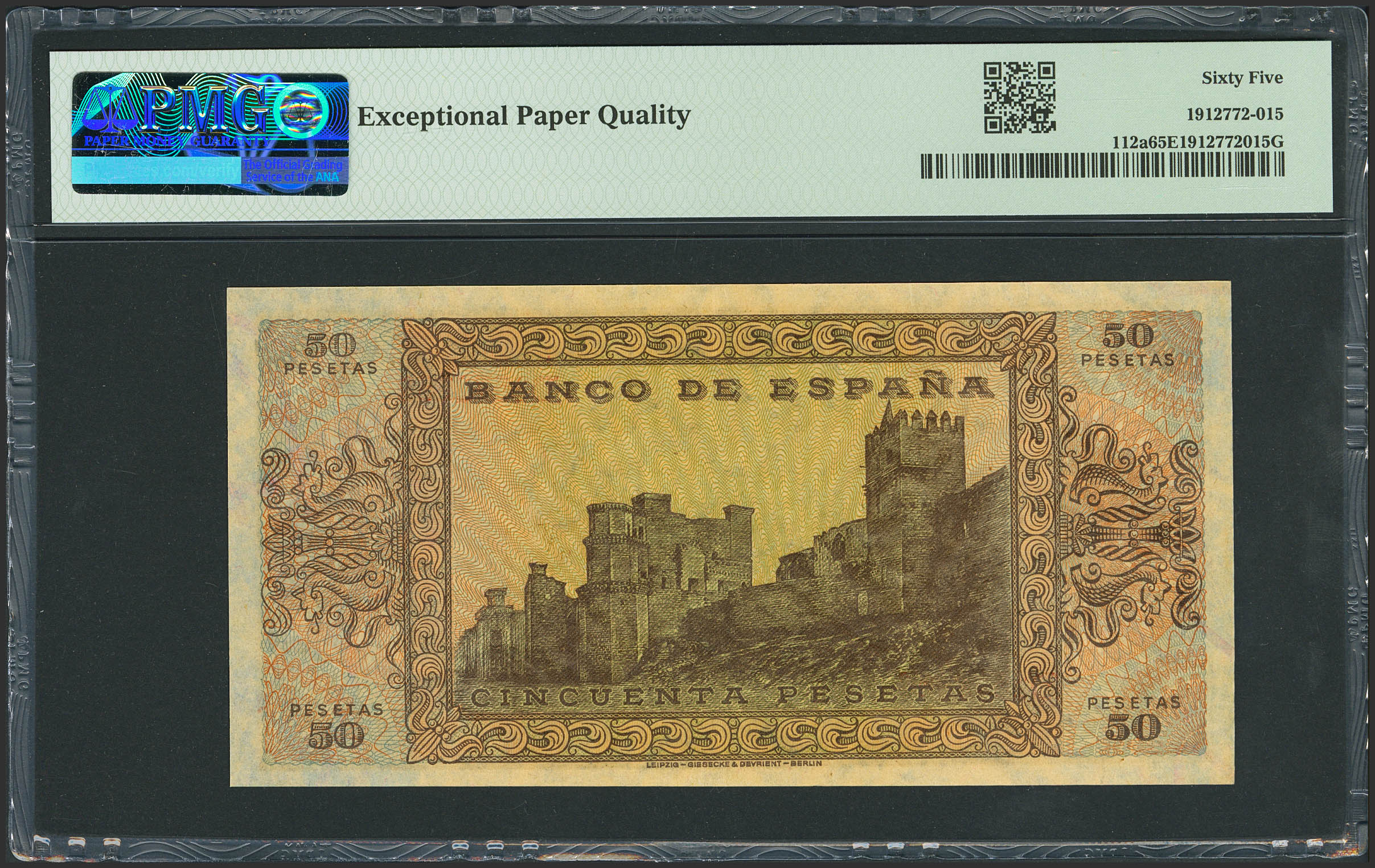 50 Pesetas. 20 de Mayo de 1938. Serie D. (Edifil 2021: 431a, Pick: 112a). Inusual en esta excepcional calidad, apresto original. SC. Encapsulado PMG65EPQ.