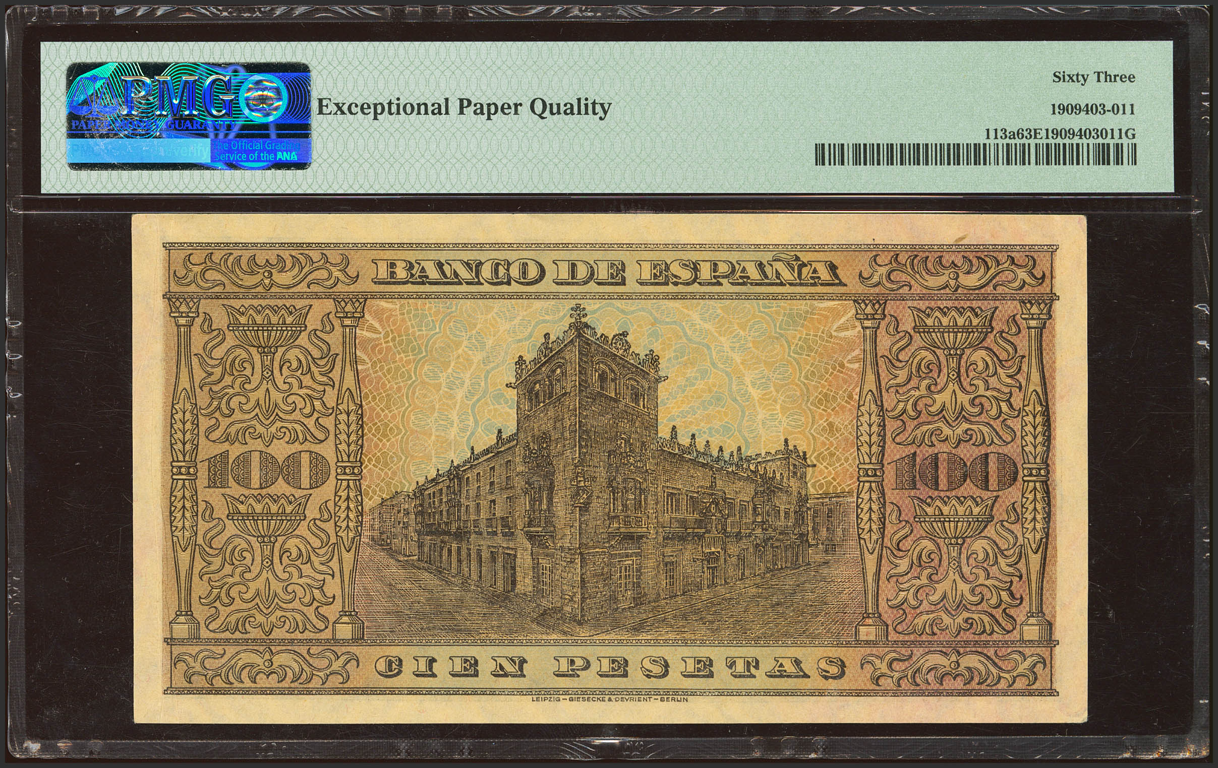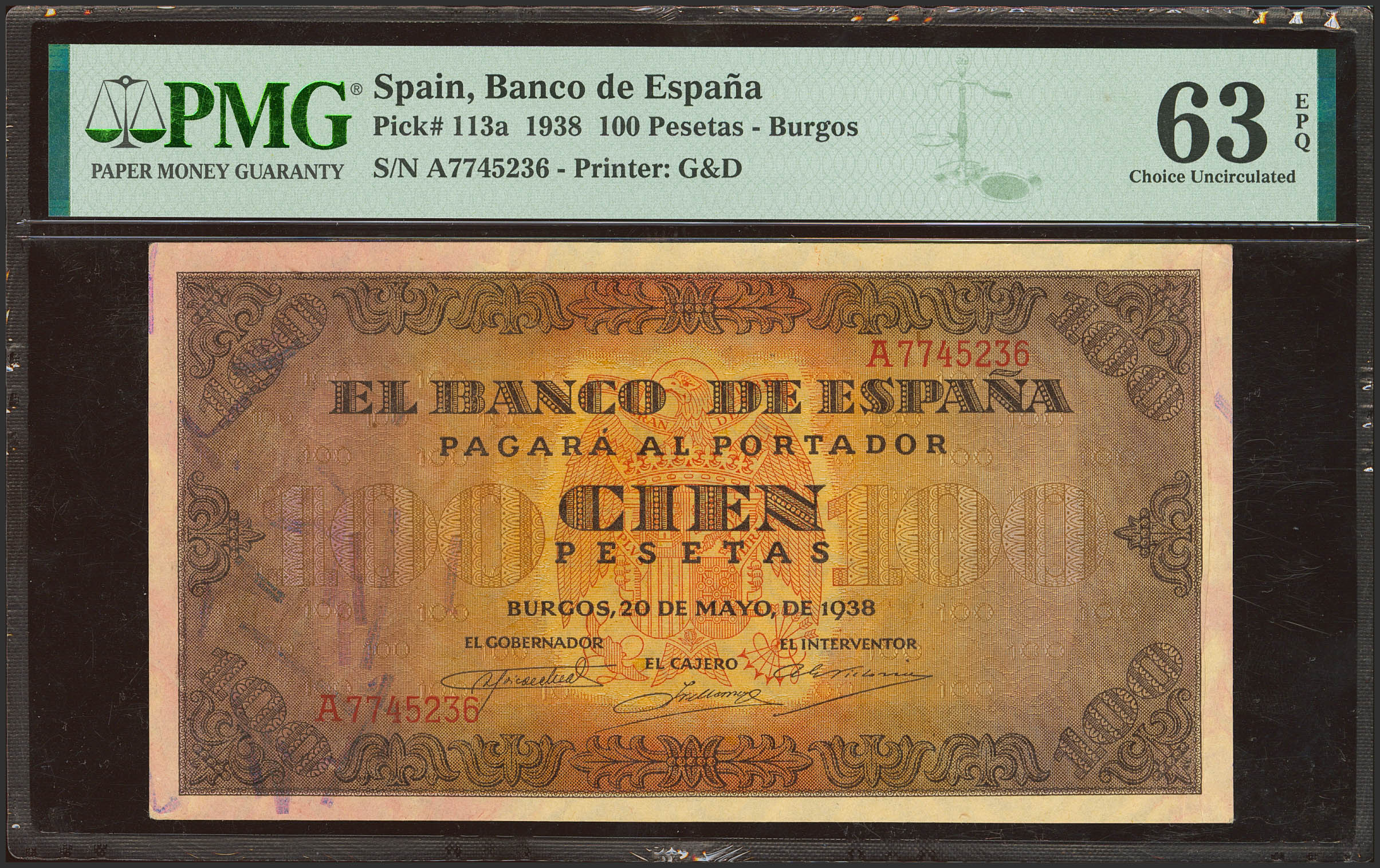 100 Pesetas. 20 de Mayo de 1938. Serie A. (Edifil 2023: 432, Pick: 113a). Inusual en esta excepcional calidad, apresto original. SC. Encapsulado PMG63EPQ.