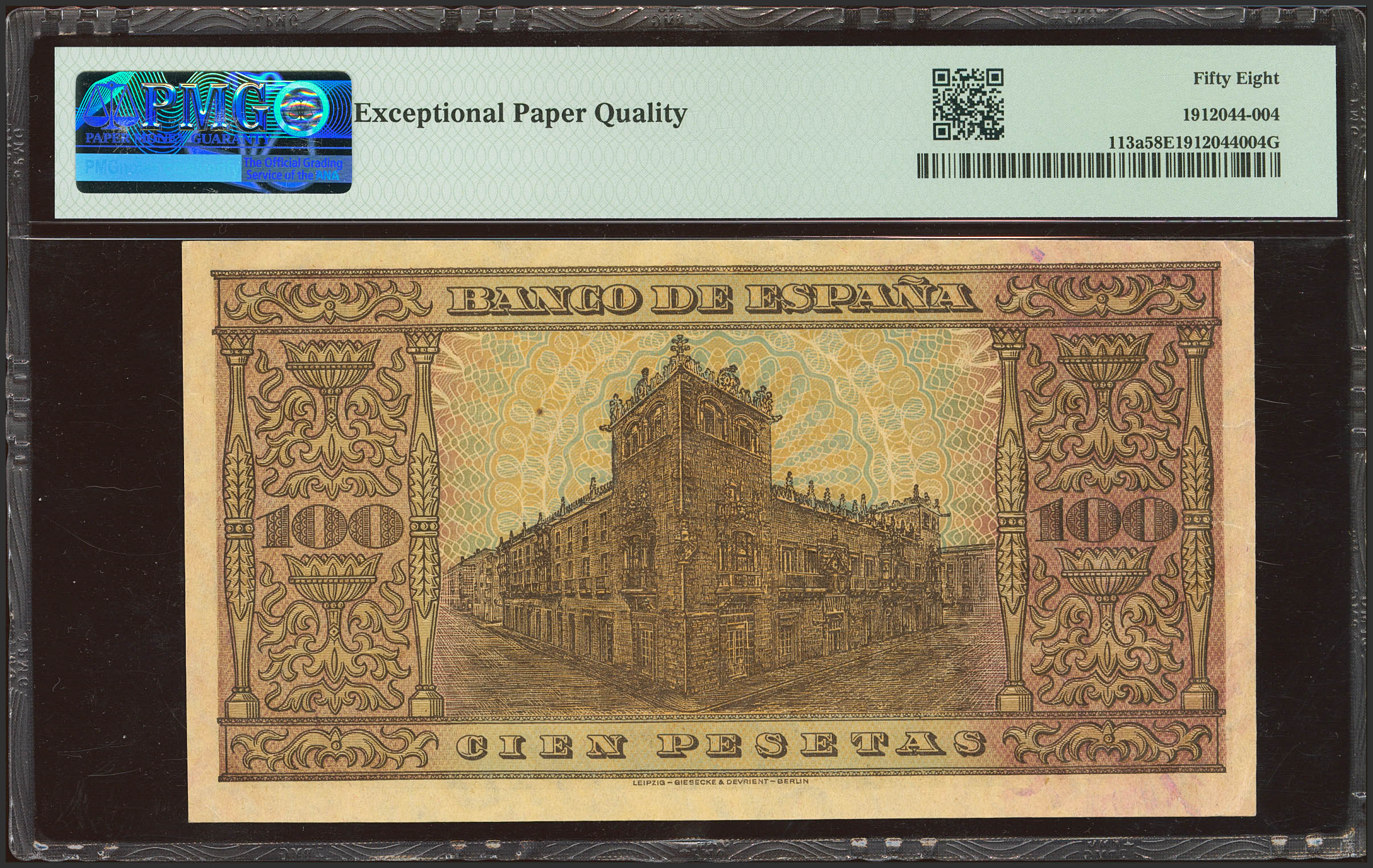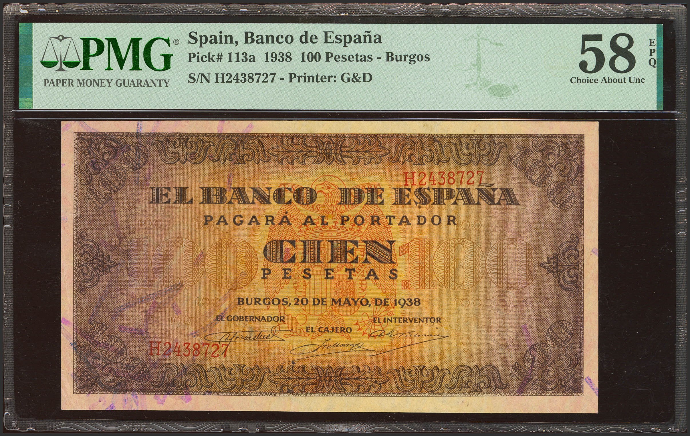 100 Pesetas. 20 de Mayo de 1938. Serie H, última serie emitida. (Edifil 2023: 432b, Pick: 113a). Apresto original. EBC+++. Encapsulado PMG58EPQ.