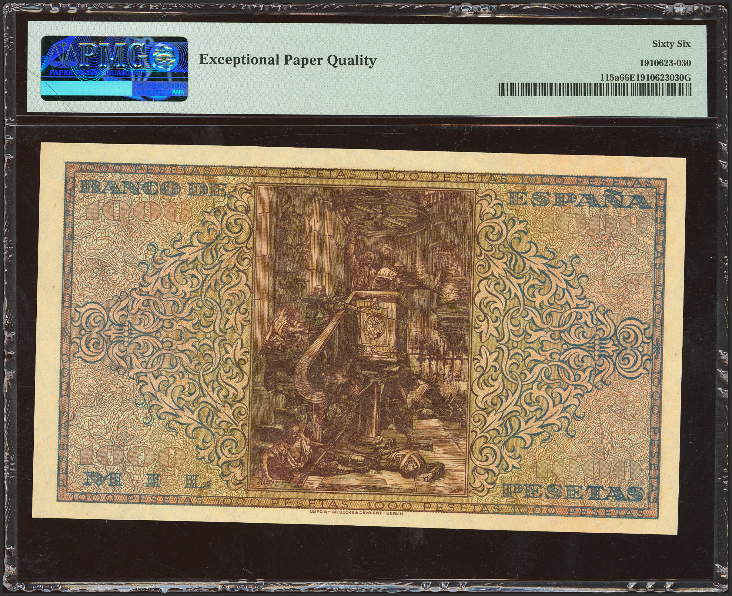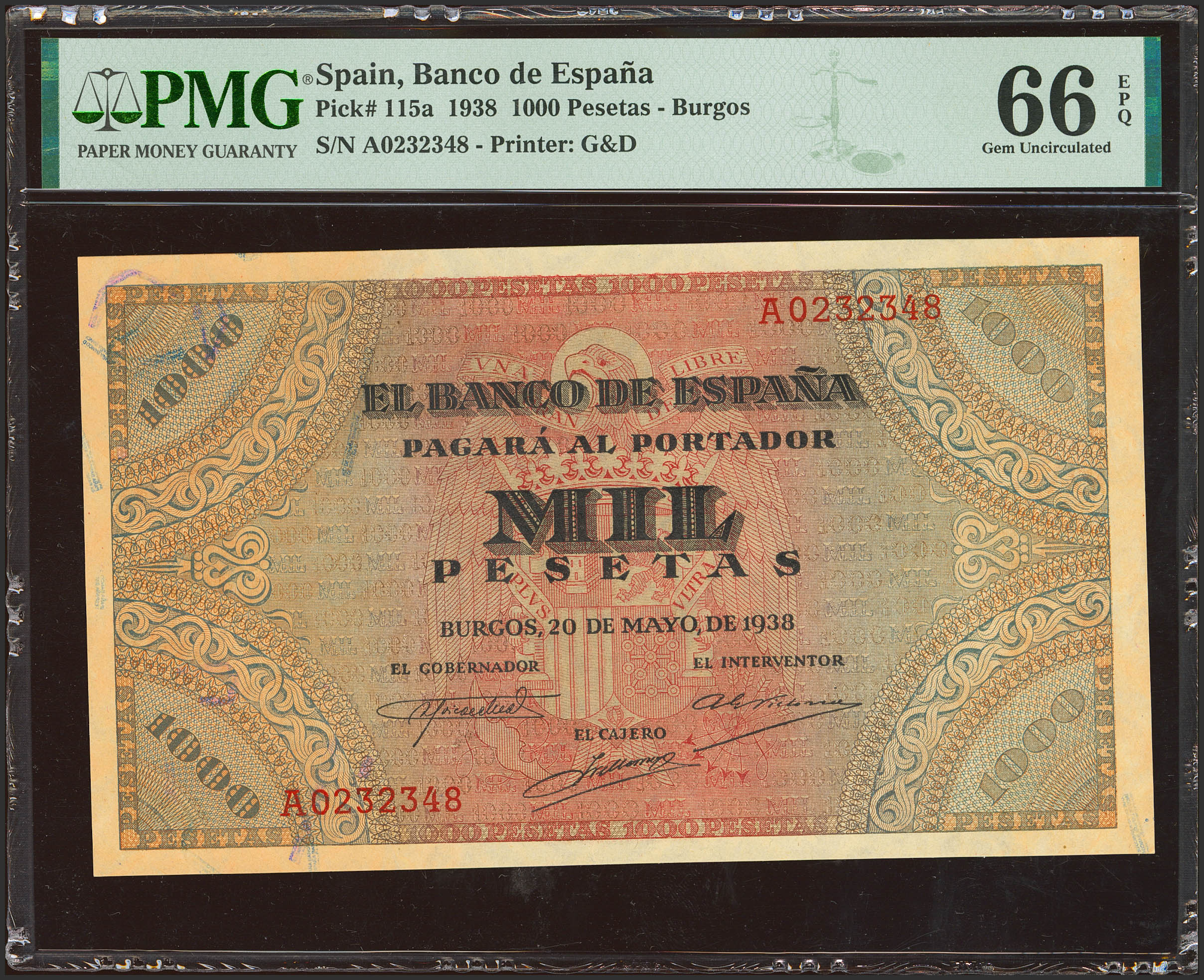 1000 Pesetas. 20 de Mayo de 1938. Serie A. (Edifil 2021: 434, Pick: 115a). Rarísimo en esta excepcional calidad, apresto original. SC. Encapsulado PMG66EPQ. (Para hacernos una idea de la rareza de este billete, a fecha 1 de Julio de 2022, es el segundo billete mejor calificado junto a otros nueve billetes en PMG)
