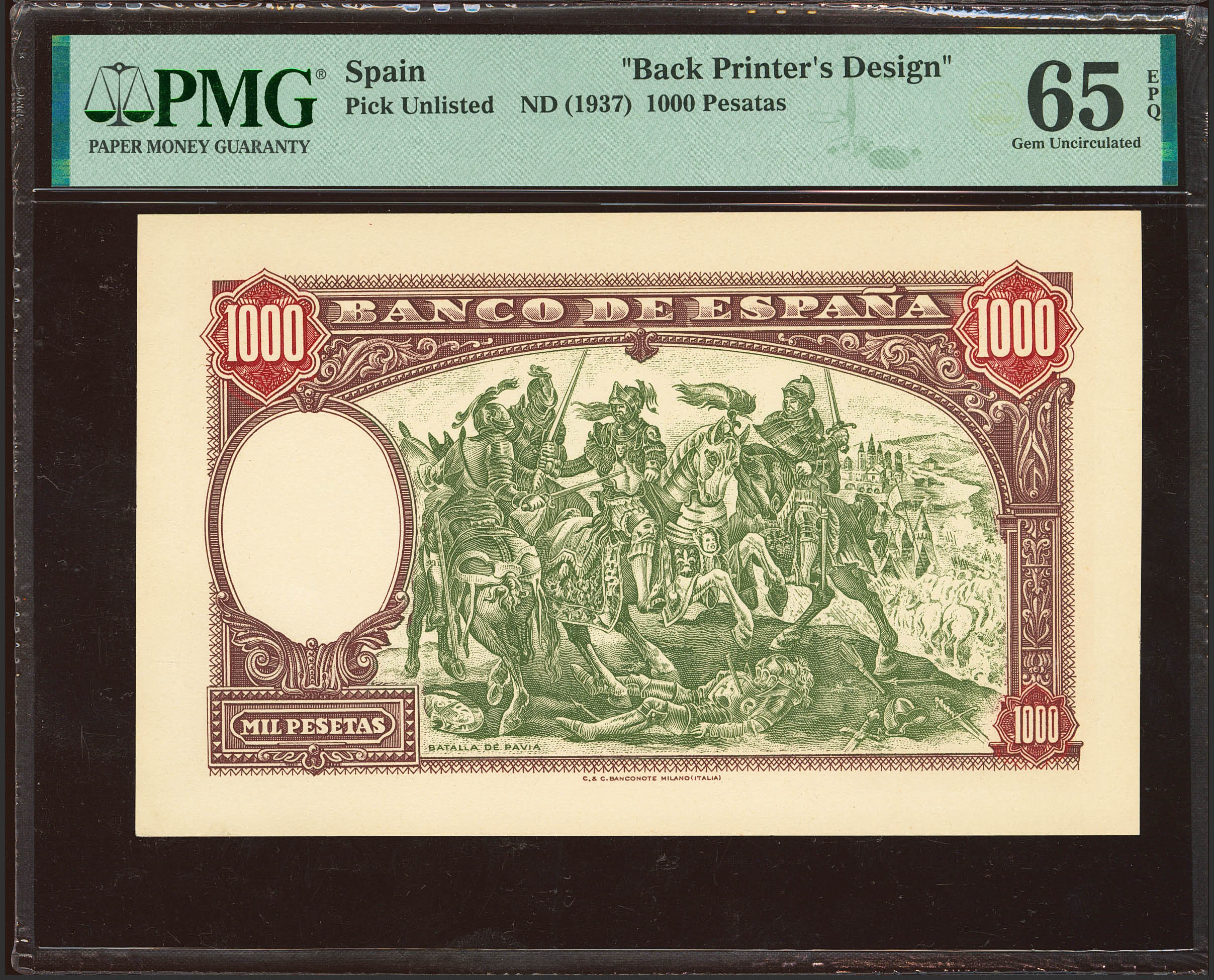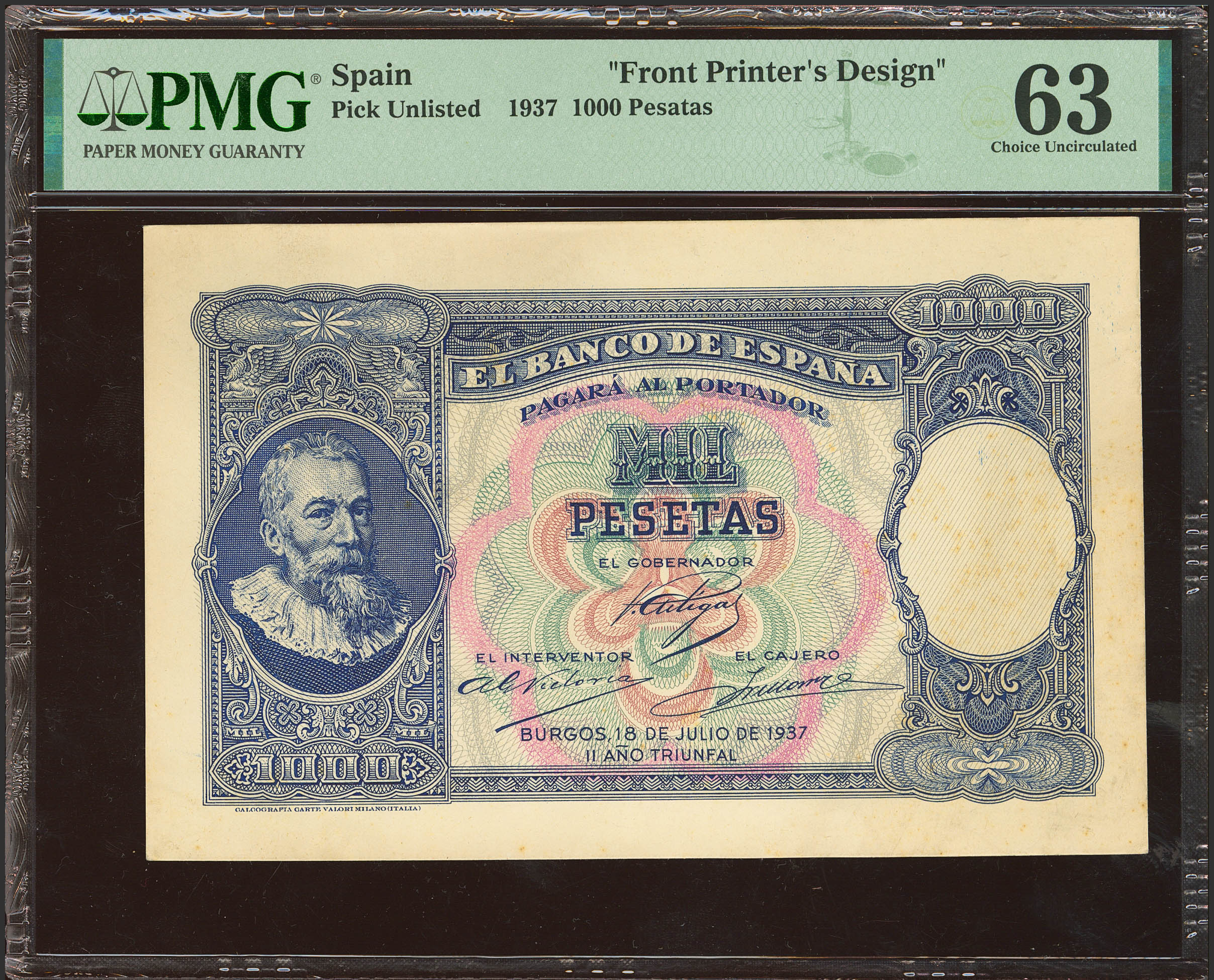 Conjunto de las pruebas de anverso y reverso de un billete no emitido de 1000 Pesetas, fechado el 18 de Julio de 1937. Sin numeración. (Edifil 2021: NE45P). Extraordinariamente raro conjunto, conserva todo su apresto original. SC. Encapsulado PMG63 (minor stains)/65EPQ.
