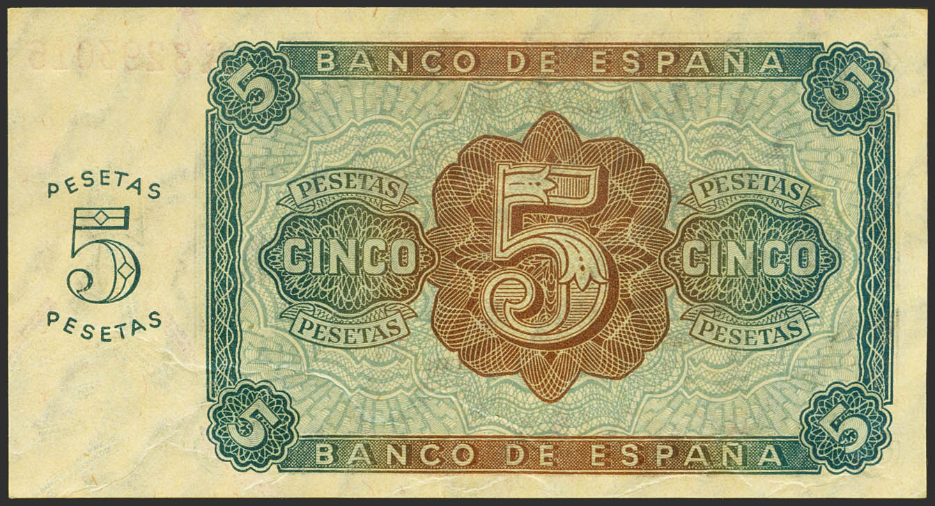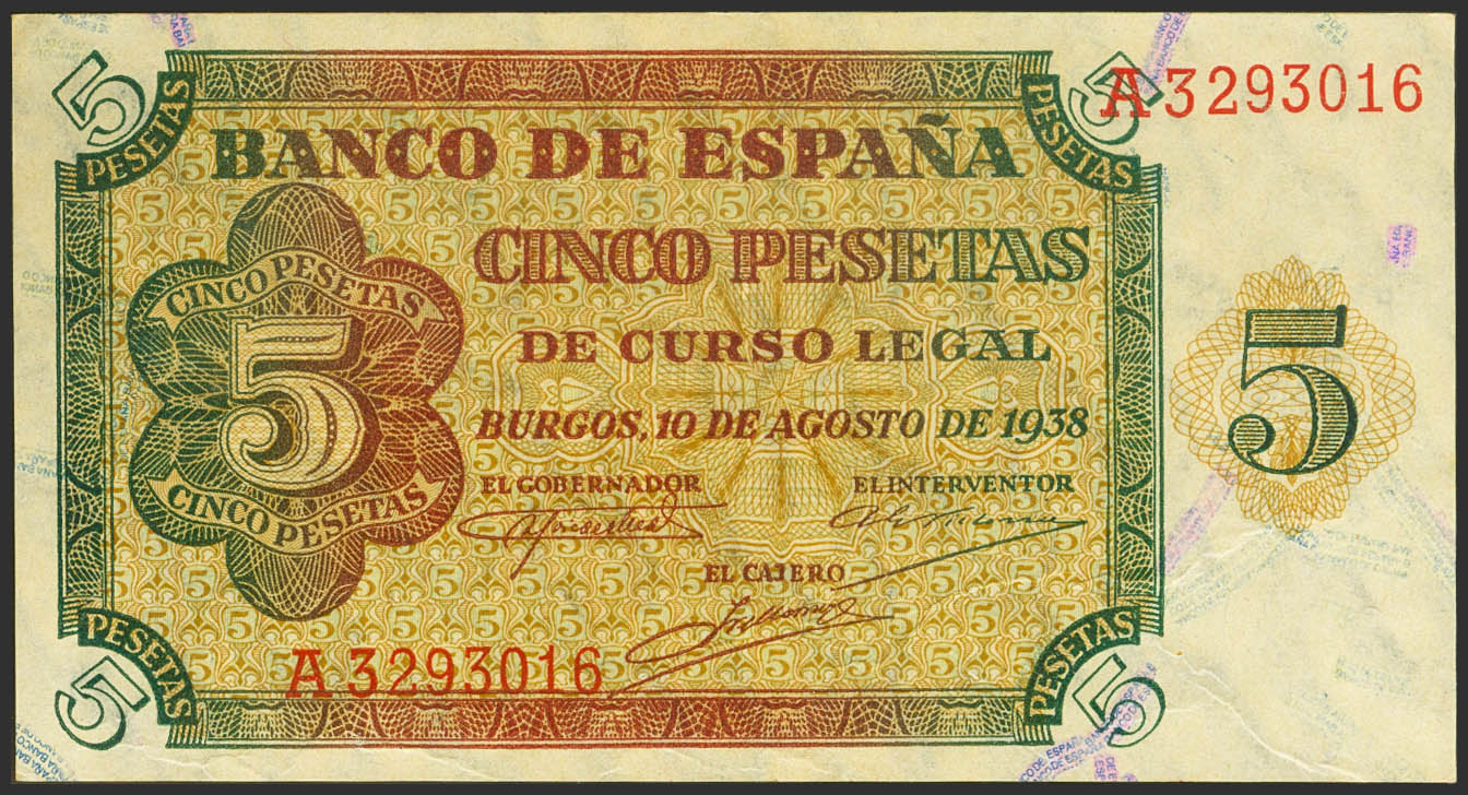5 Pesetas. 10 de Agosto de 1938. Serie A. (Edifil 2021: 435). Apresto original. EBC++.