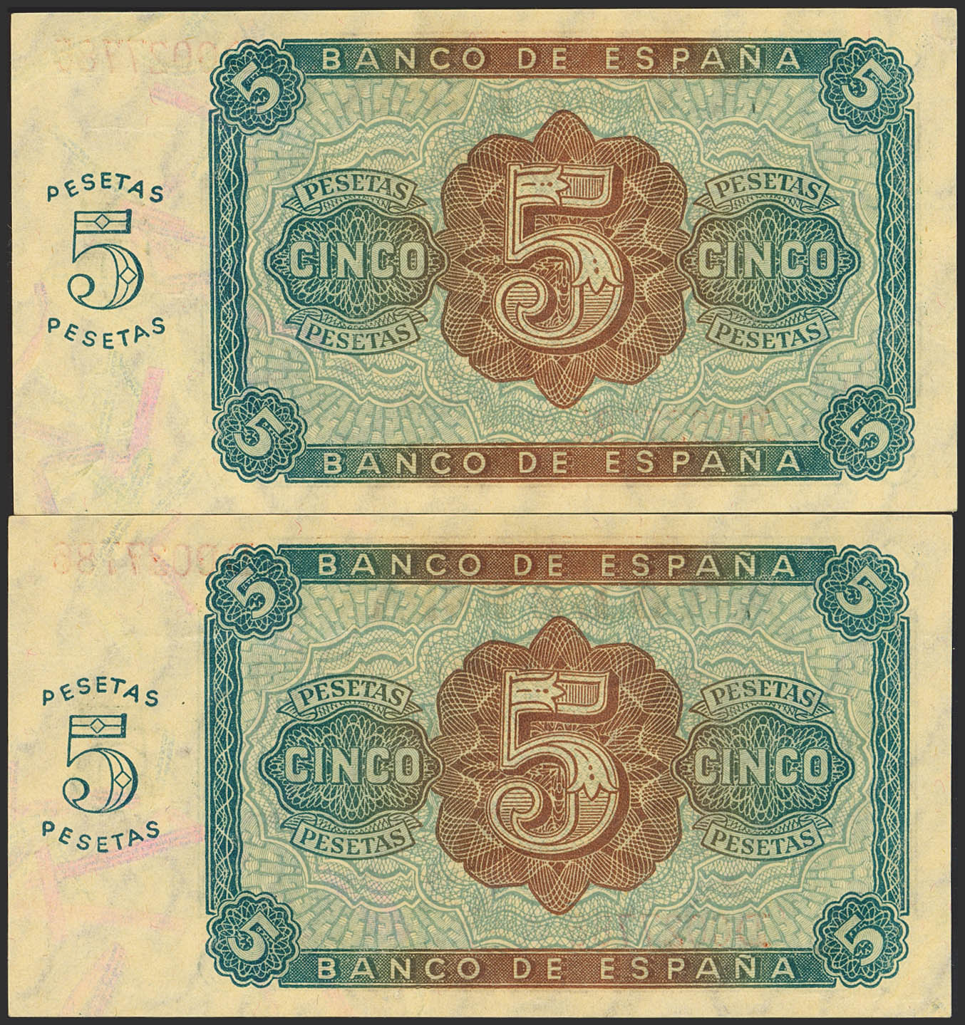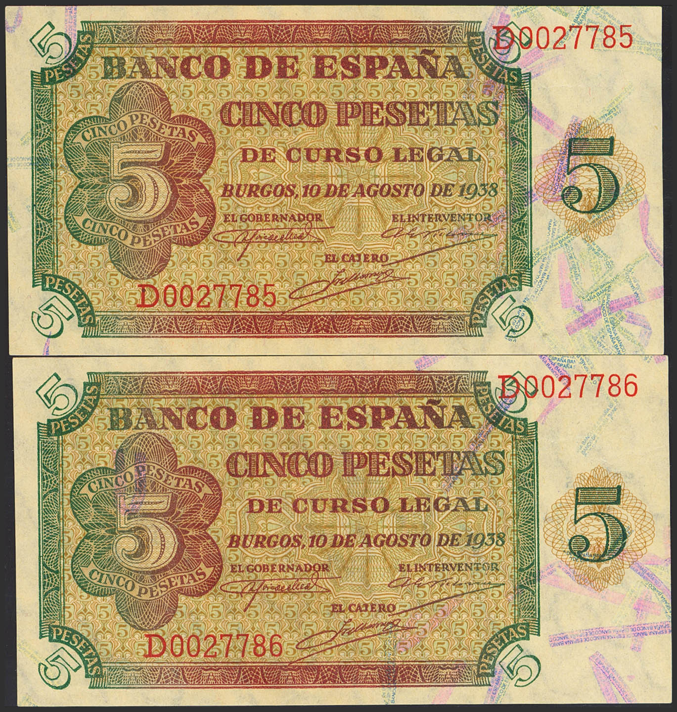 5 Pesetas. 10 de Agosto de 1938. Pareja correlativa. Serie D. (Edifil 2023: 435a). Apresto original, arruguitas naturales del papel (este es el motivo de "quitarle" el SC). SC--.