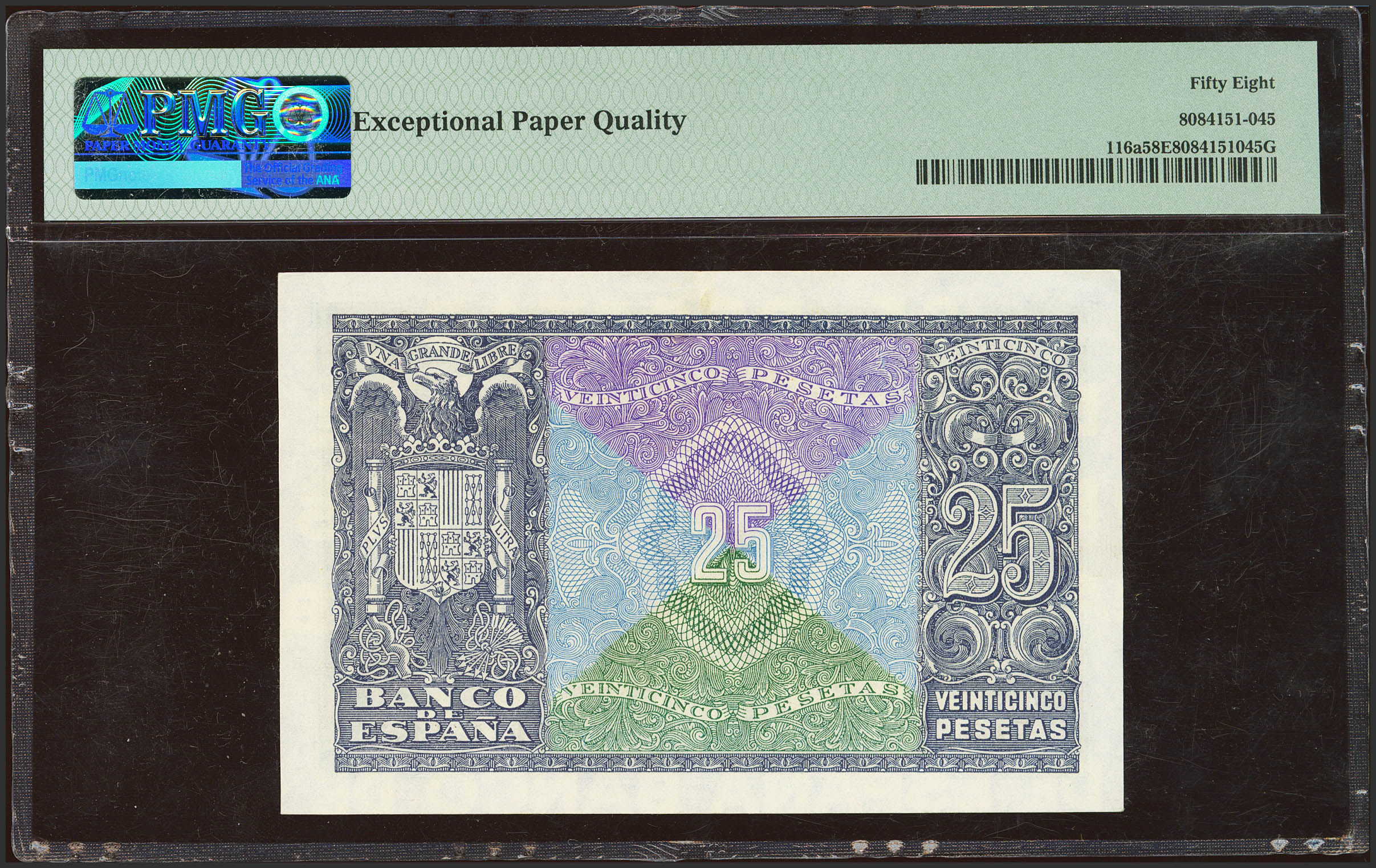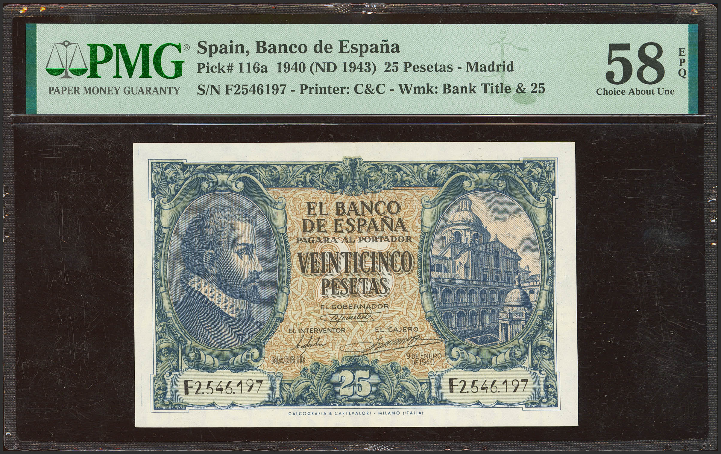 25 Pesetas. 9 de Enero de 1940. Serie F, última serie emitida. (Edifil 2023: 436b, Pick: 116a). Apresto original. EBC+++. Encapsulado PMG58EPQ.