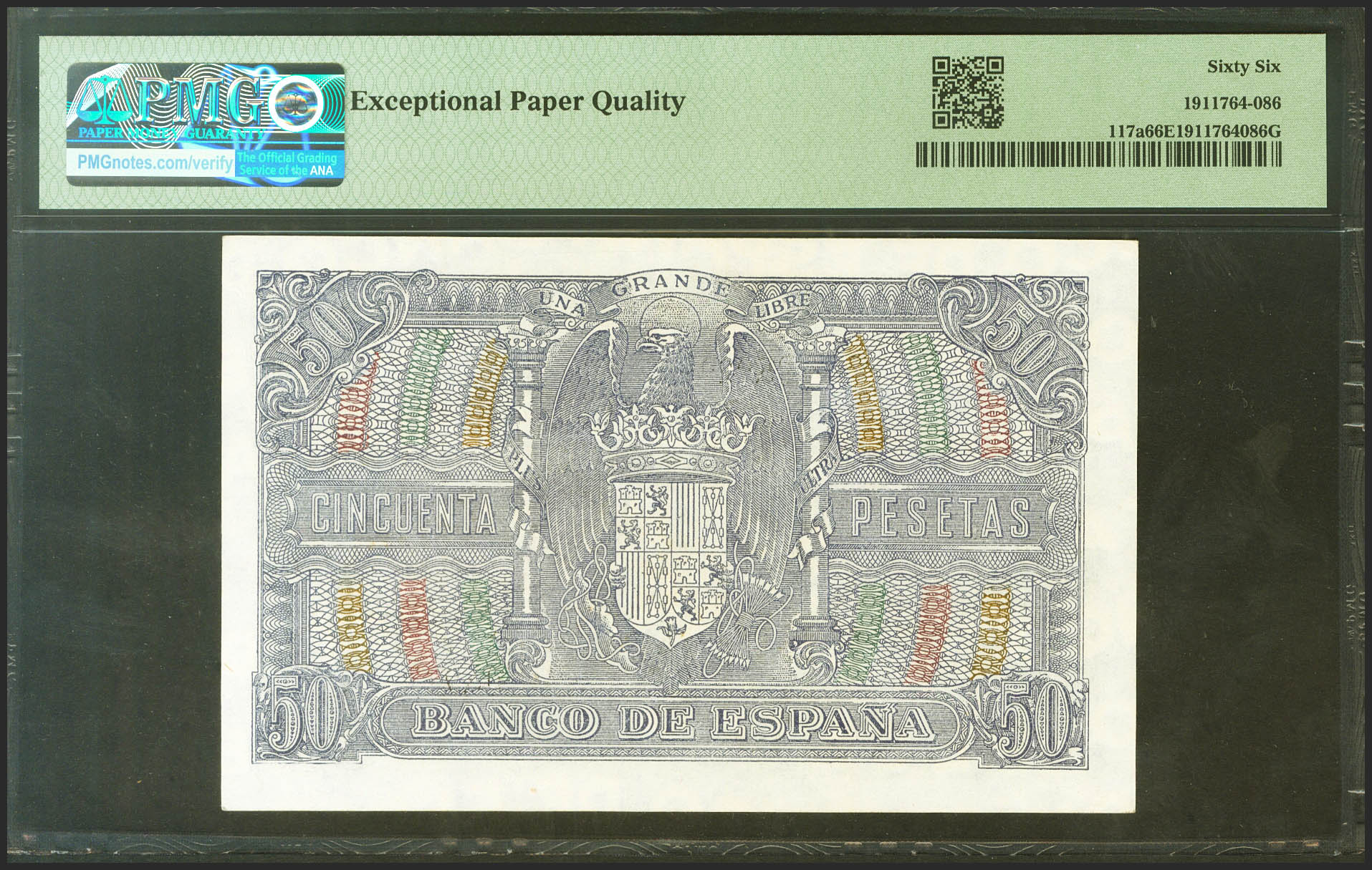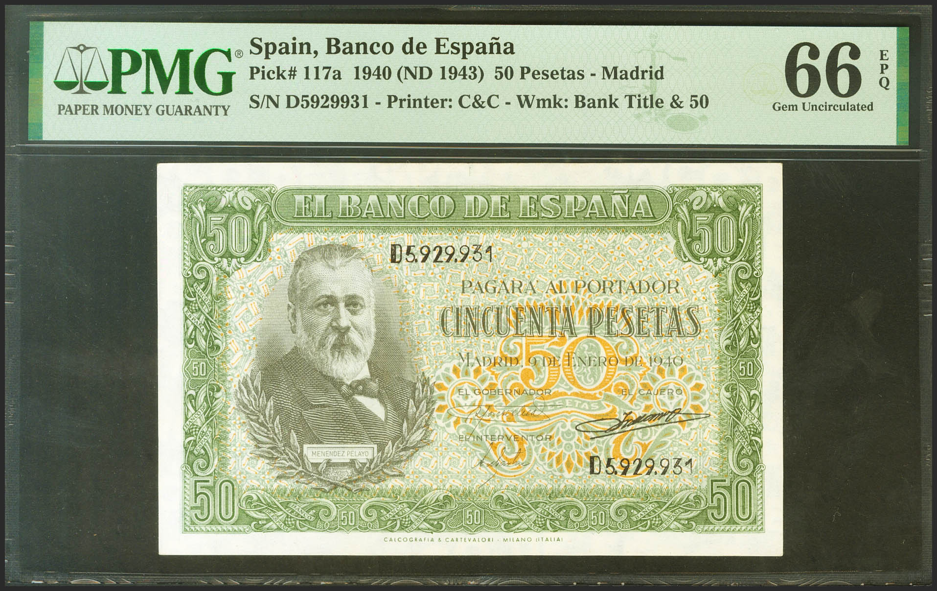 50 Pesetas. 9 de Enero de 1940. Serie D. (Edifil 2021: 437a, Pick: 117a). Raro en esta excepcional calidad, apresto original. SC. Encapsulado PMG66EPQ