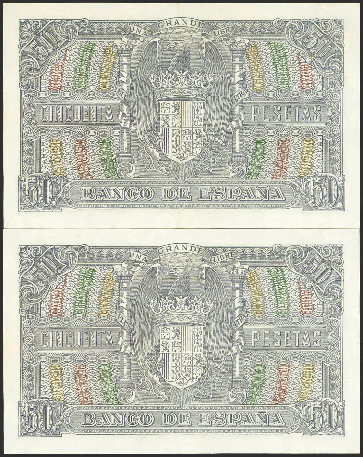 50 Pesetas. 9 de Enero de 1940. Pareja correlativa. Serie D. (Edifil 2023: 437a). Inusual, conserva parte de su apresto original. EBC++.