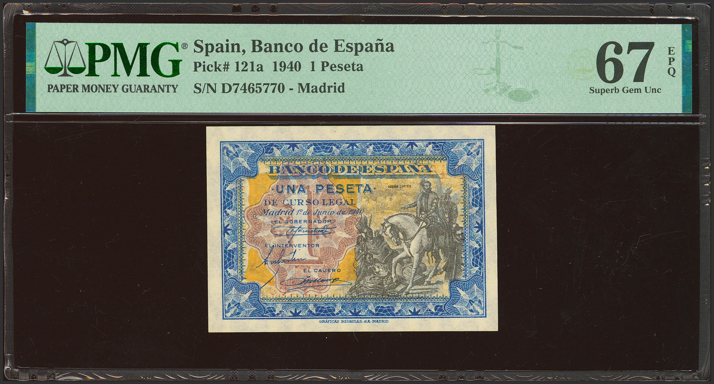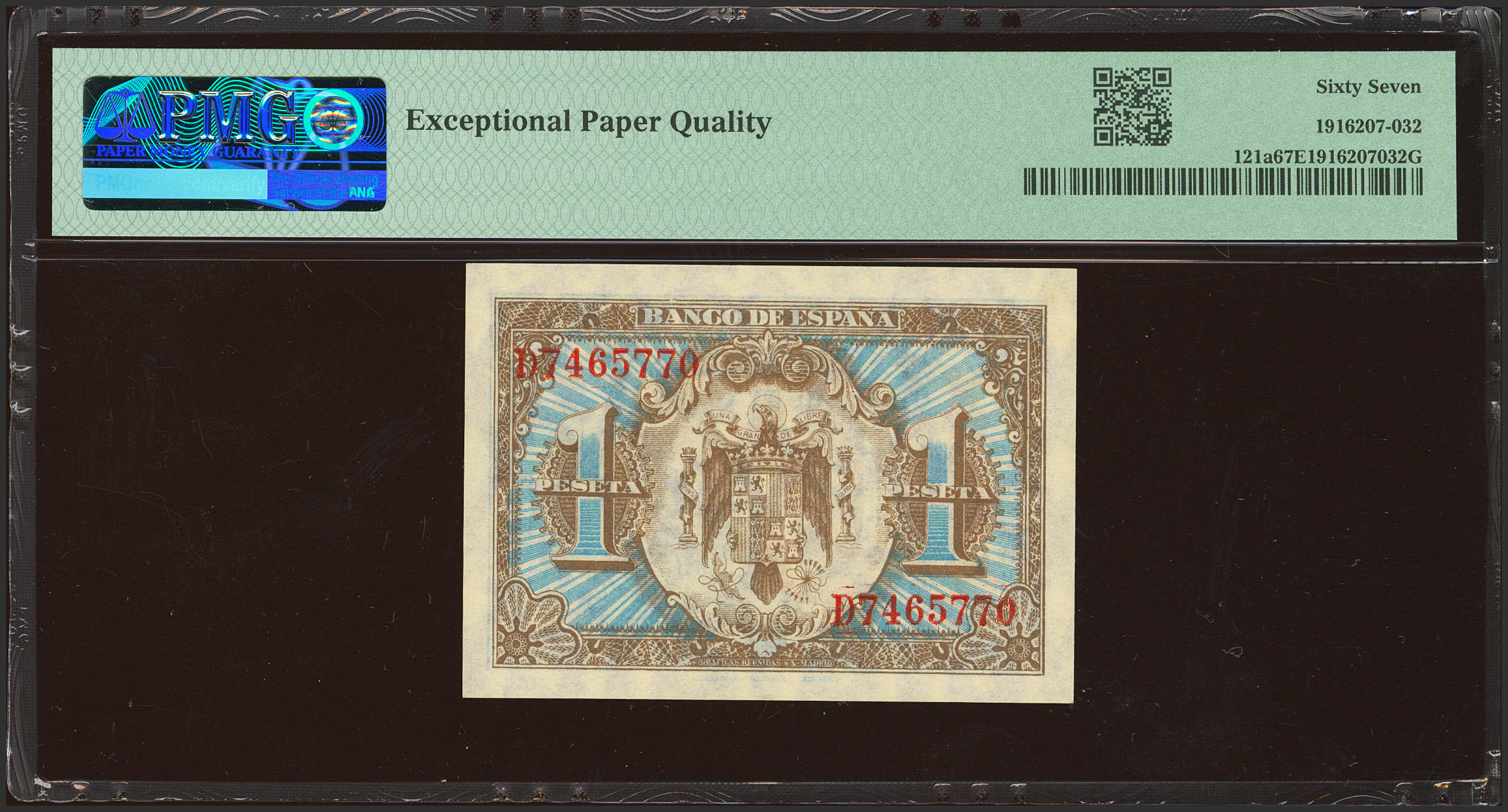 1 Peseta. 1 de Junio de 1940. Serie D. (Edifil 2023: 441a, Pick: 121a). Raro en esta excepcional calidad, apresto original. SC. Encapsulado PMG67EPQ.