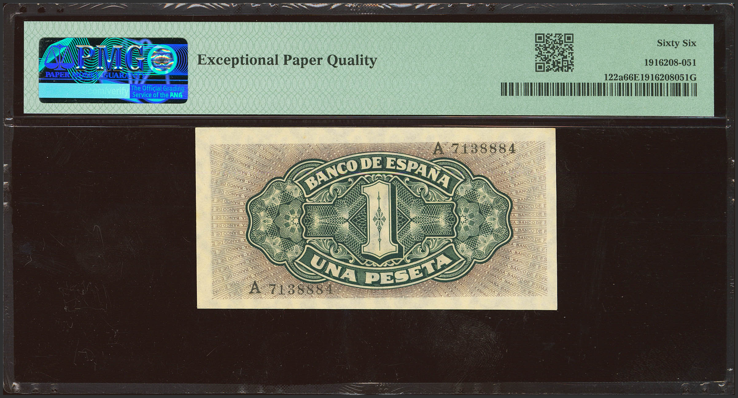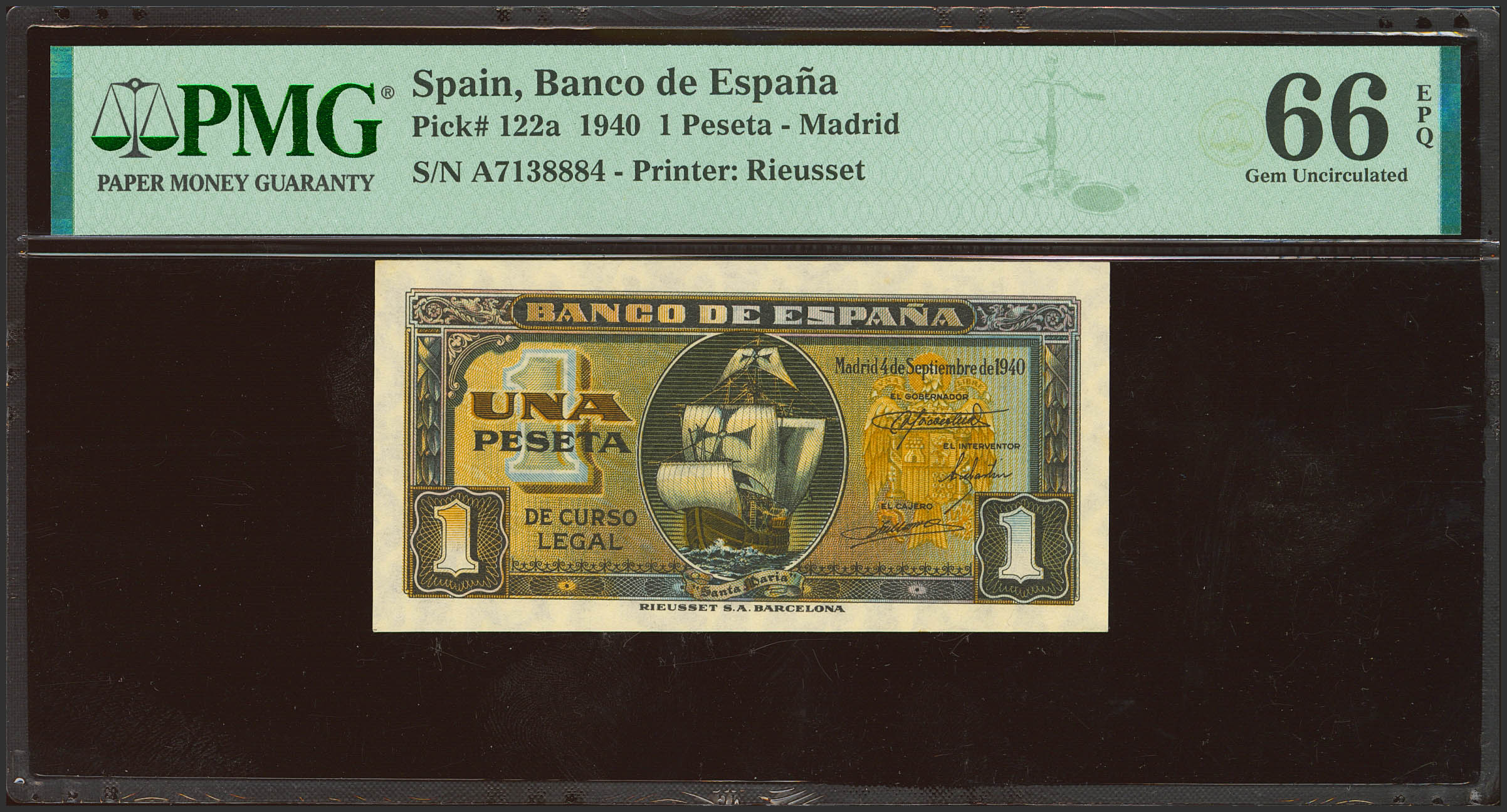 1 Peseta. 4 de Septiembre de 1940. Serie A. (Edifil 2023: 442a, Pick: 122a). Inusual en esta calidad, apresto original. SC. Encapsulado PMG66EPQ.