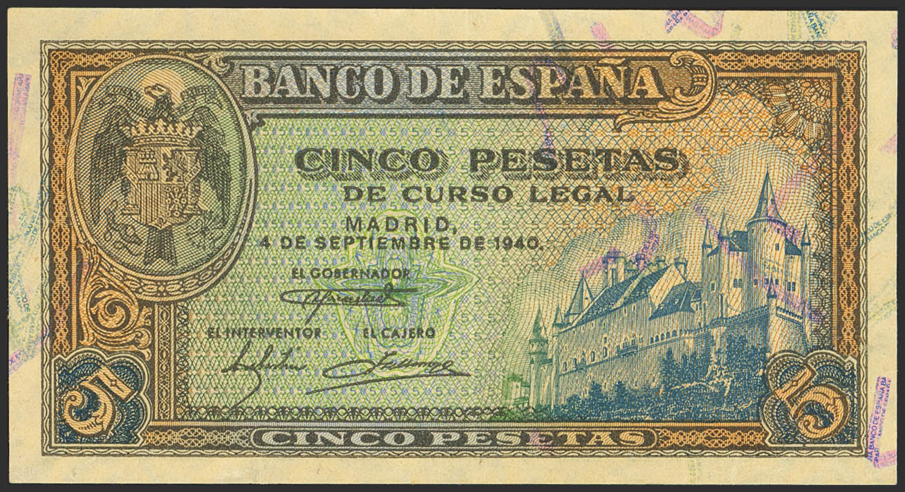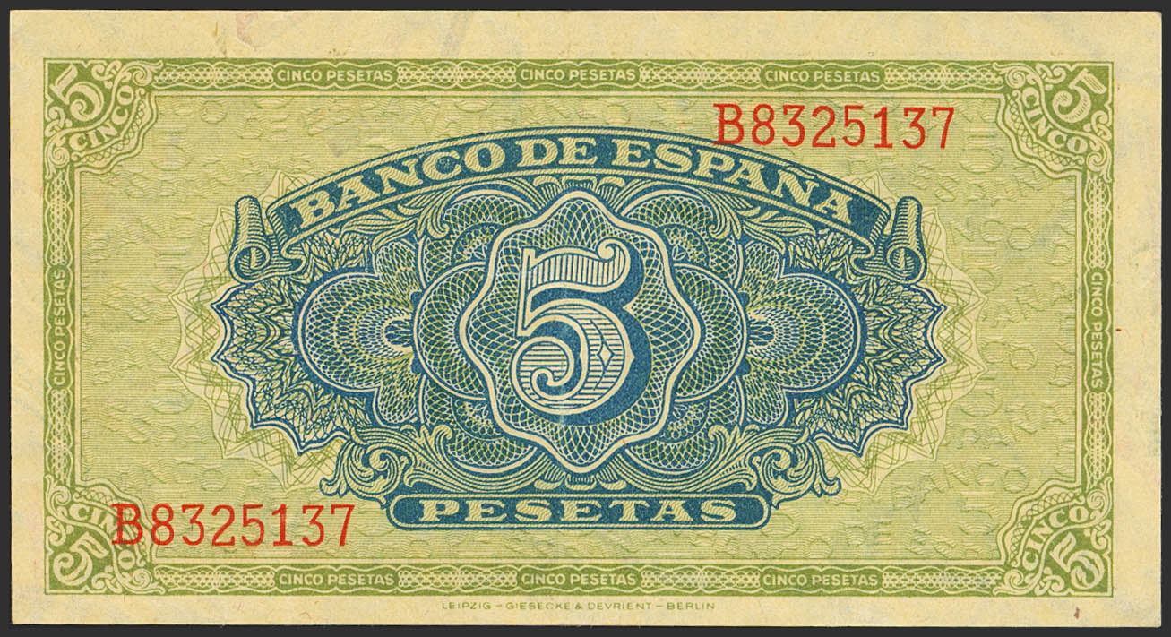 5 Pesetas. 4 de Septiembre de 1940. Serie B. (Edifil 2023: 443a). Conserva parte de su apresto original. EBC.