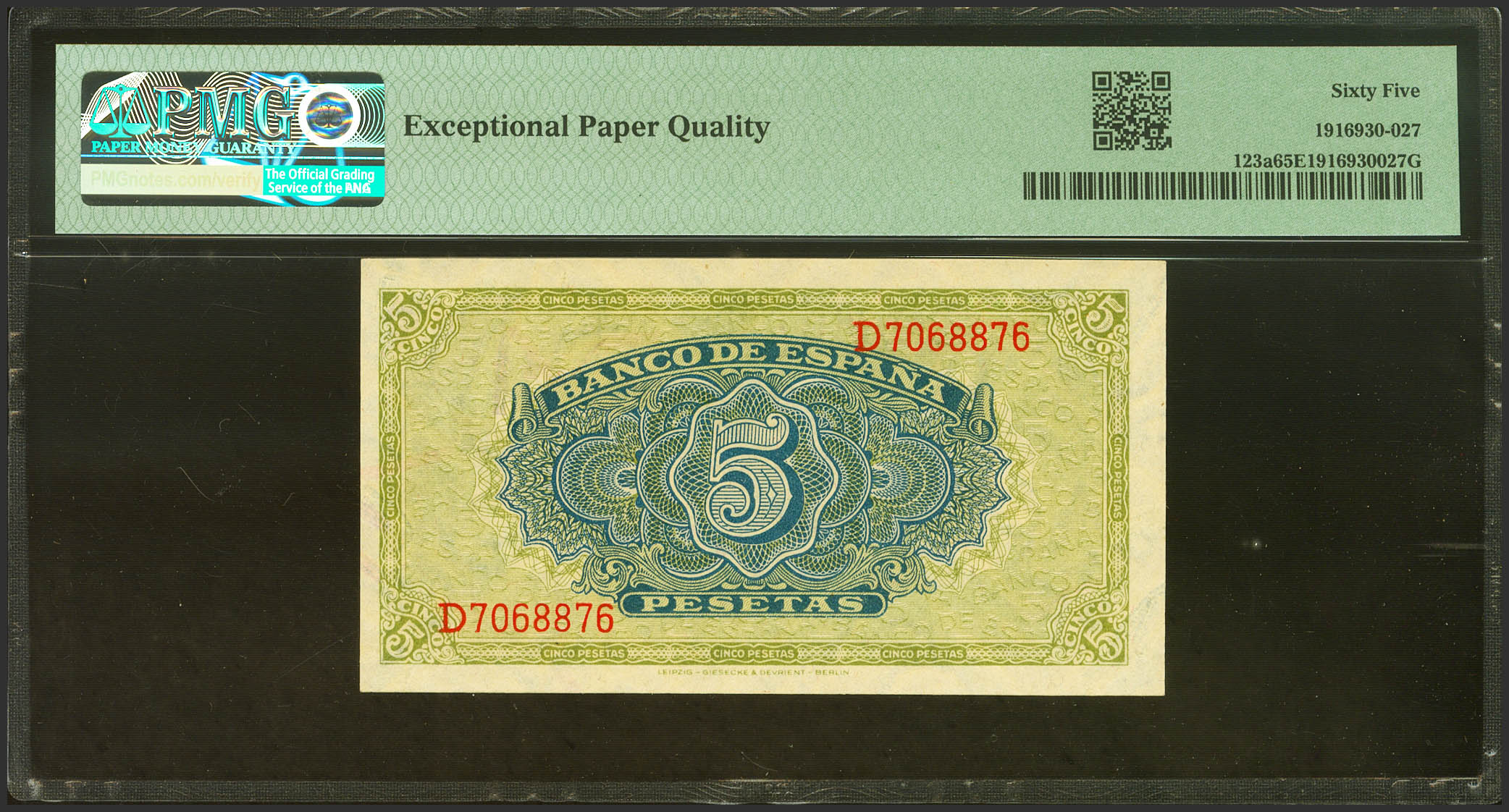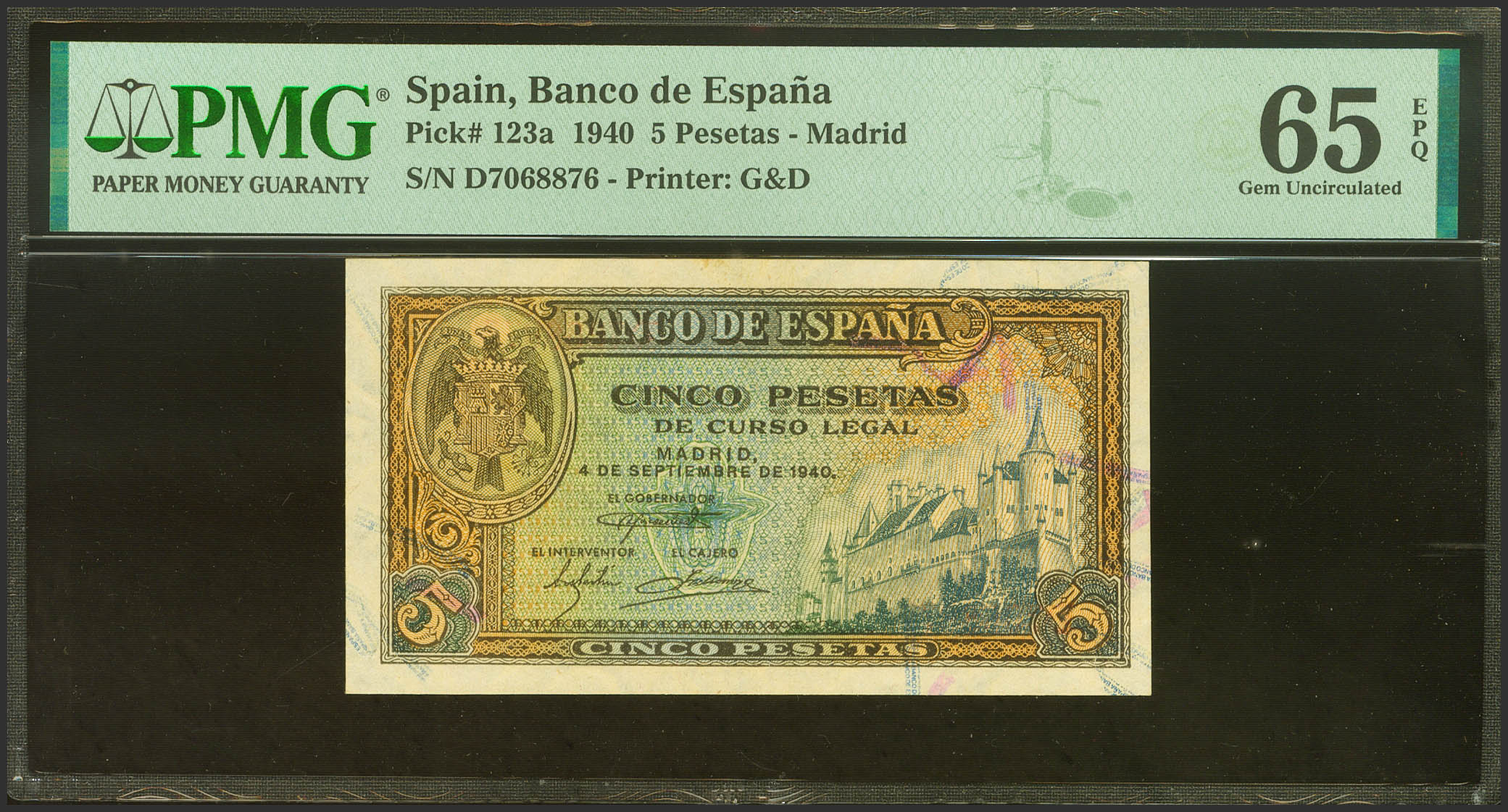 5 Pesetas. 4 de Septiembre de 1940. Serie D. (Edifil 2023: 443a, Pick: 123a). Inusual en esta calidad, apresto original. SC. Encapsulado PMG65EPQ.
