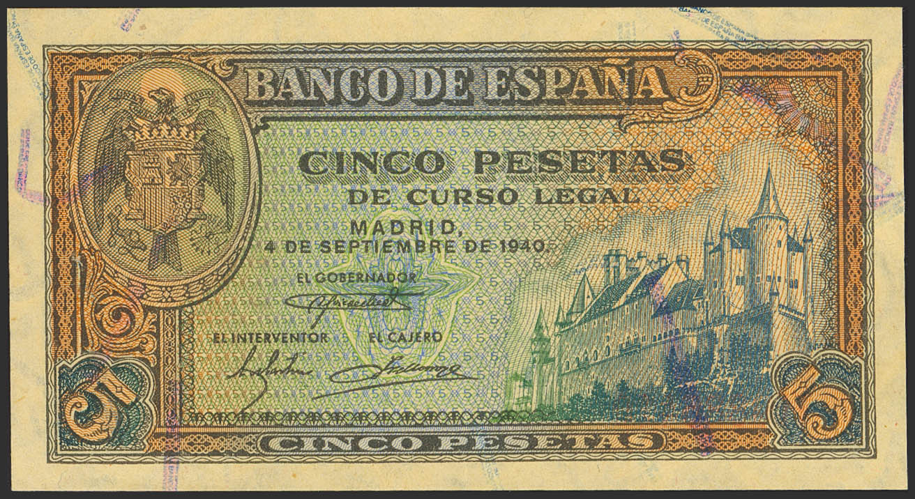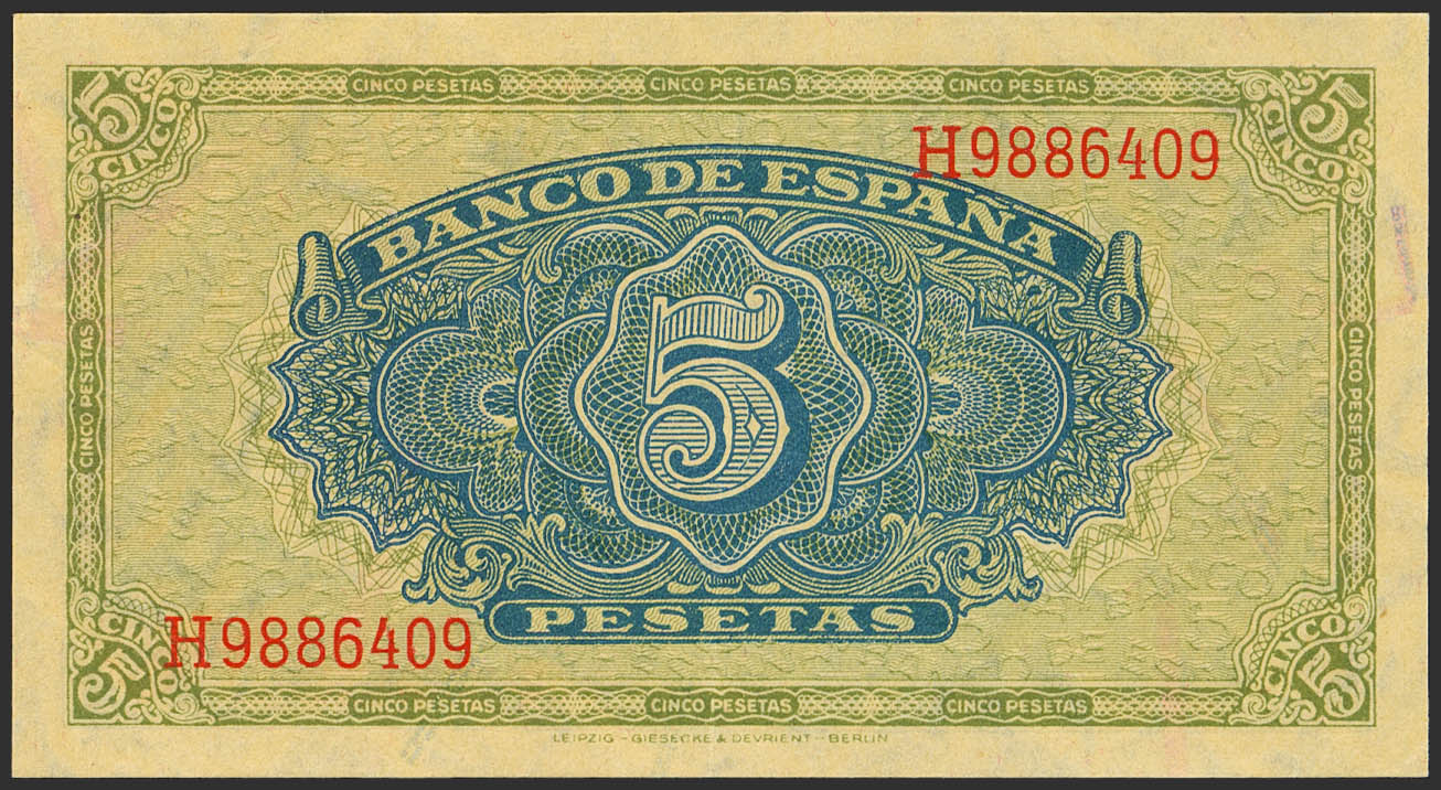 5 Pesetas. 4 de Septiembre de 1940. Serie H. (Edifil 2023: 443). Conserva gran parte de su apresto original. EBC++.