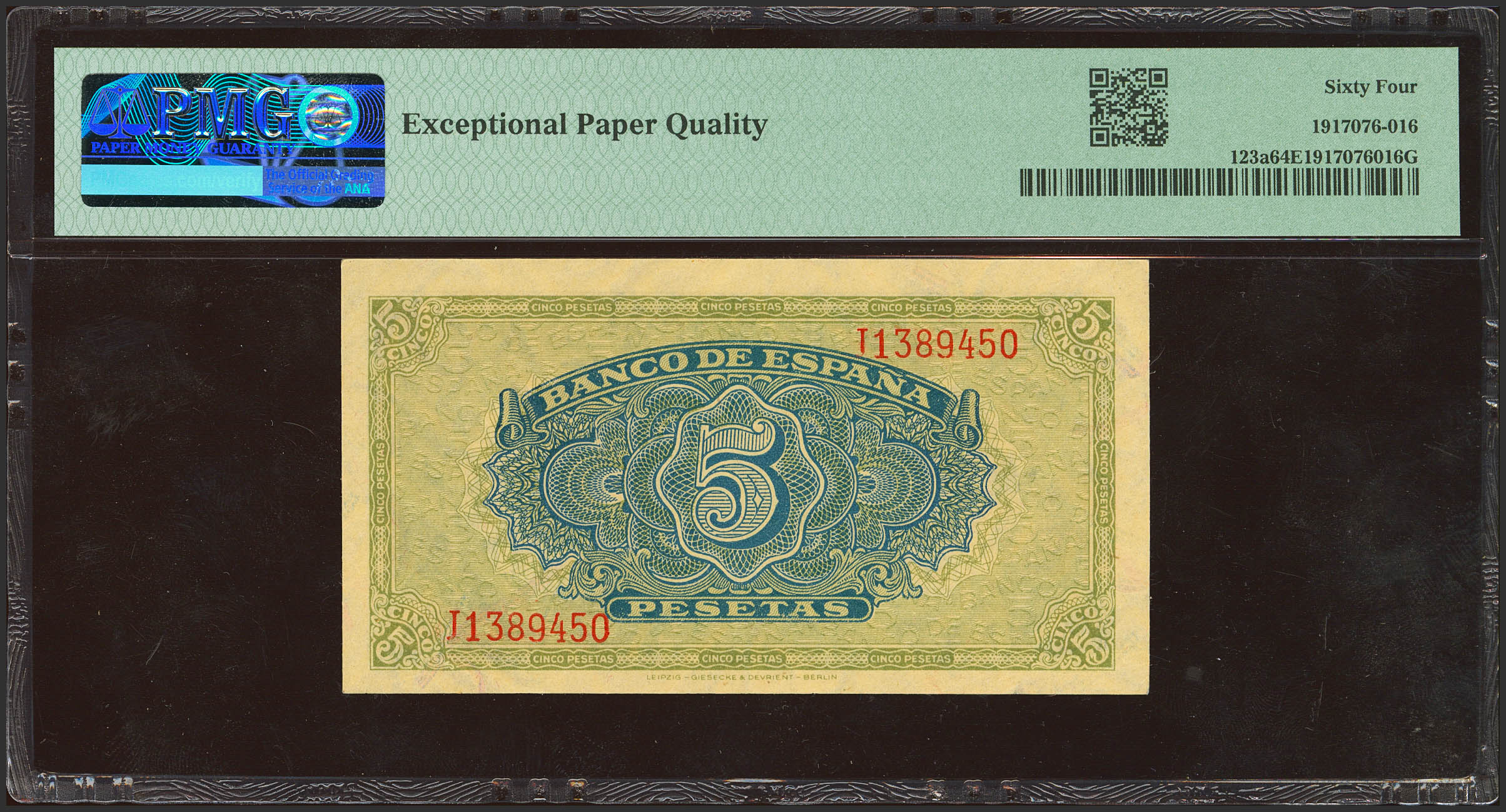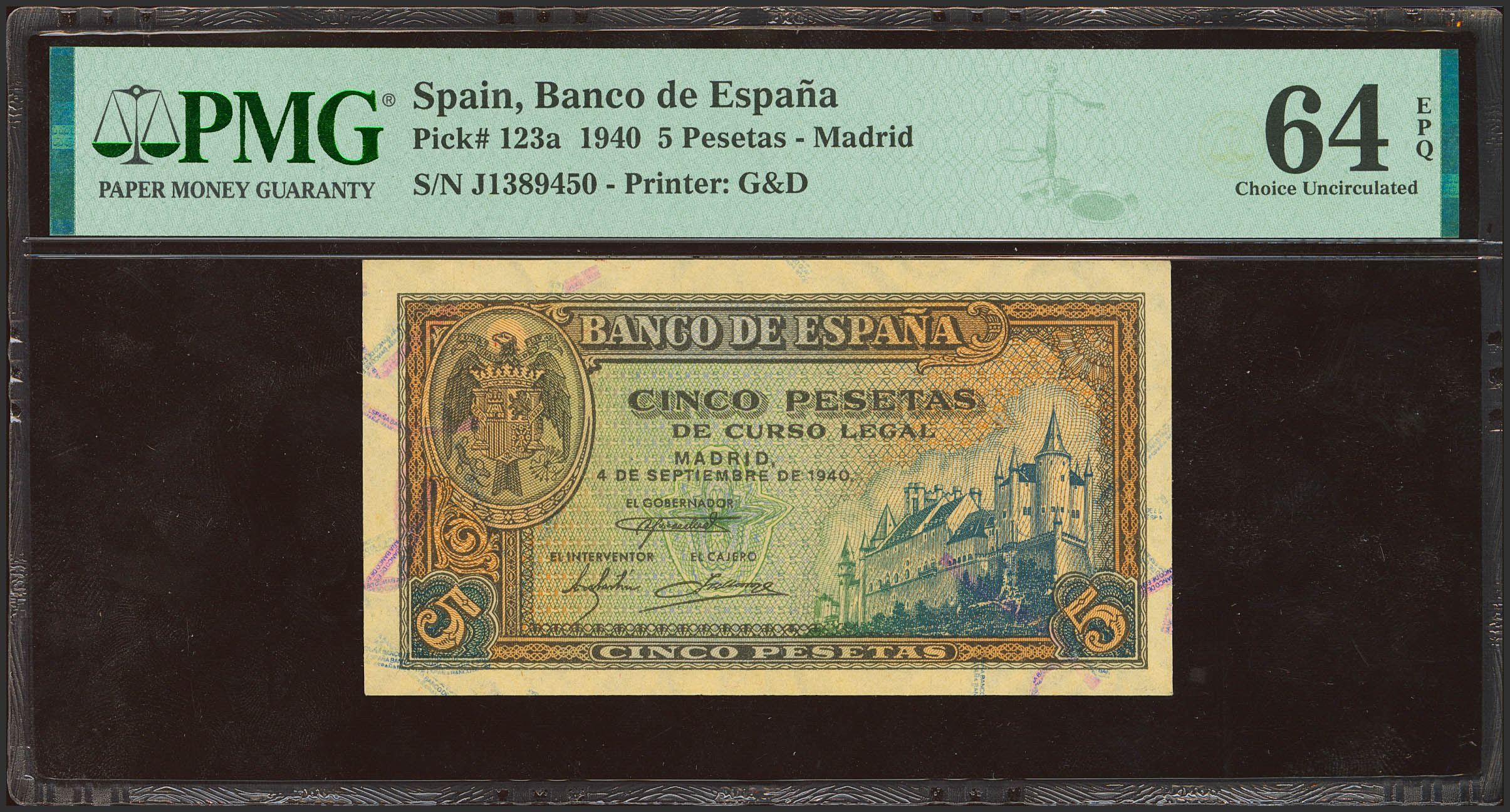 5 Pesetas. 4 de Septiembre de 1940. Serie J. (Edifil 2023: 443a, Pick: 123a). Apresto original. SC. Encapsulado PMG64EPQ.