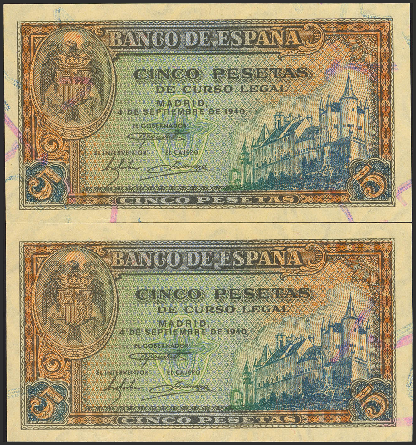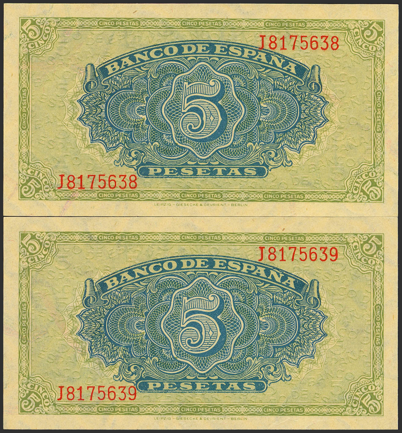 5 Pesetas. 4 de Septiembre de 1940. Pareja correlativa. Serie J. (Edifil 2023: 443a). Conserva todo su apresto original. SC-.