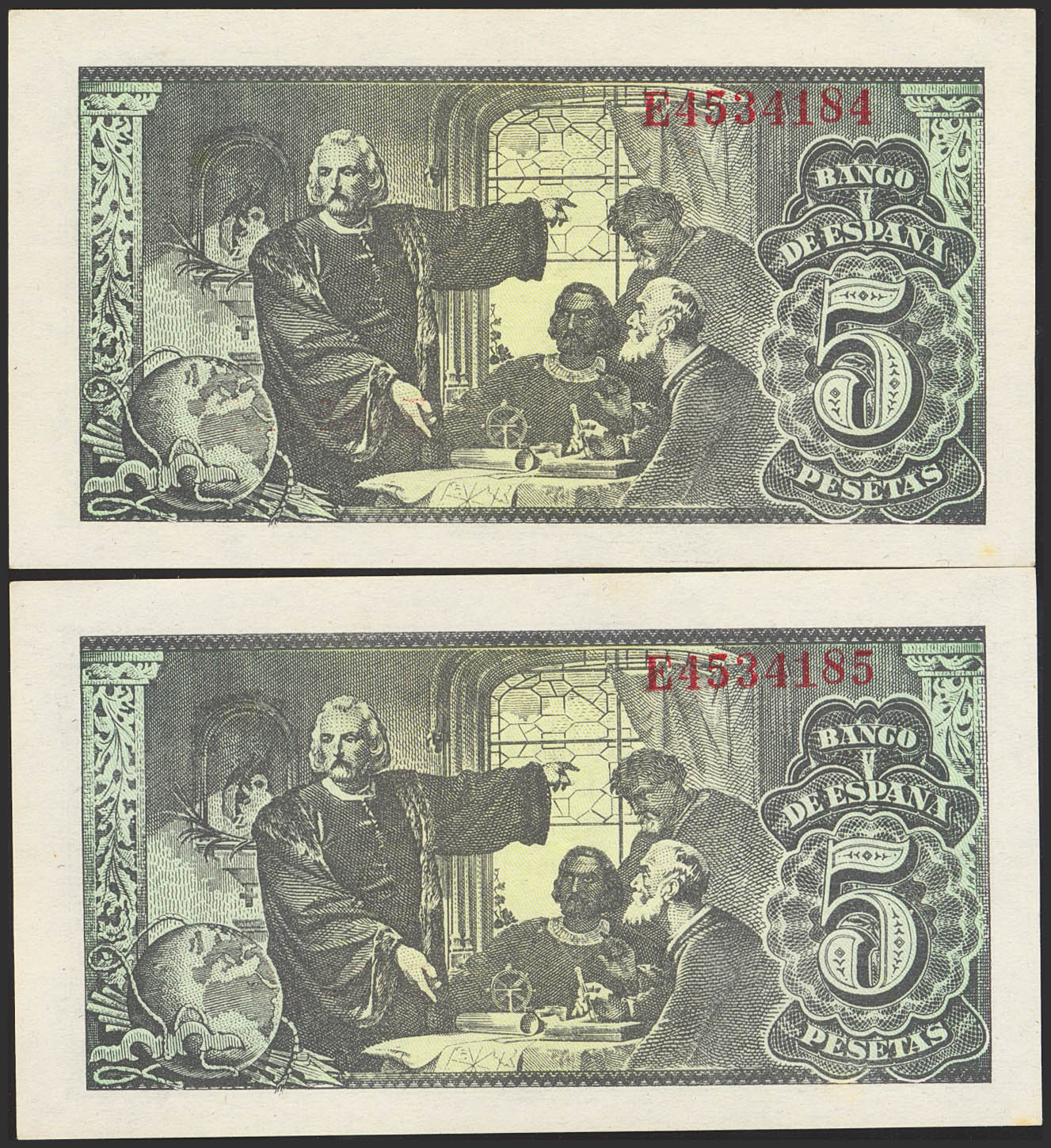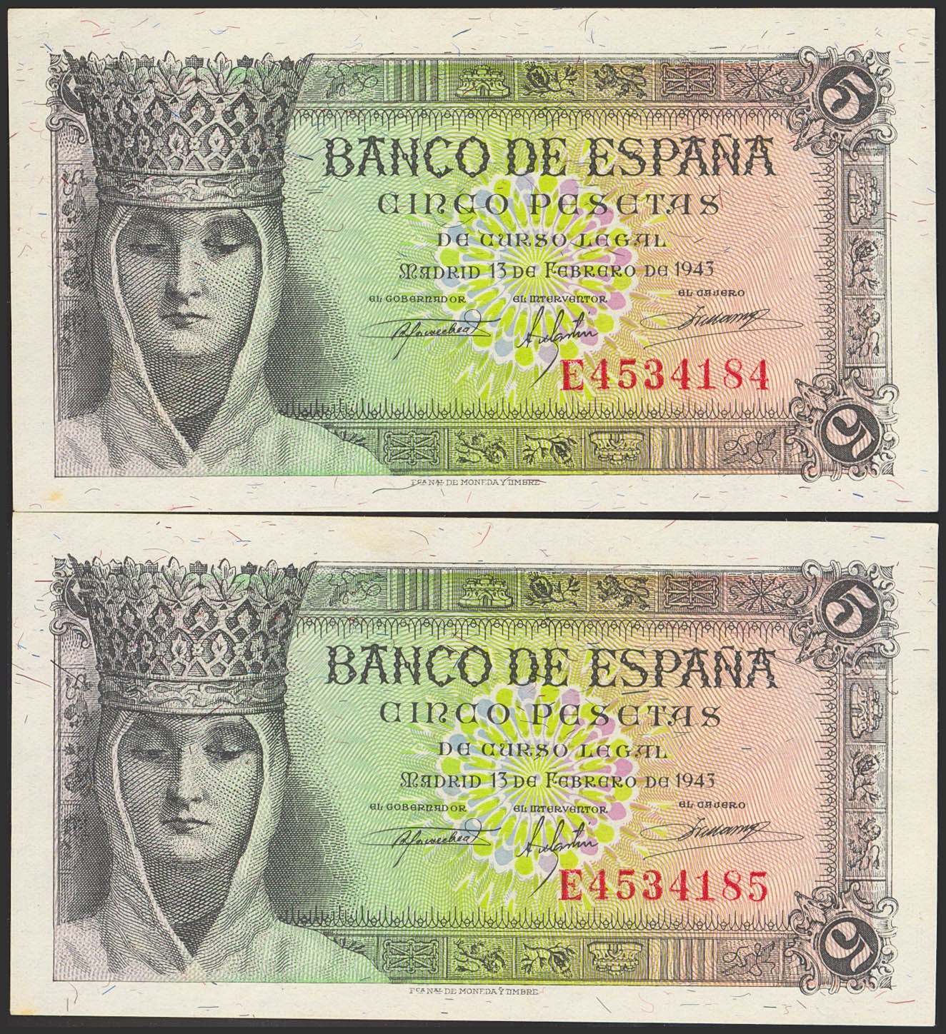 5 Peseta. 13 de Febrero de 1943. Pareja correlativa. Serie E. (Edifil 2023: 446a). Conserva parte de su apresto original. EBC+.