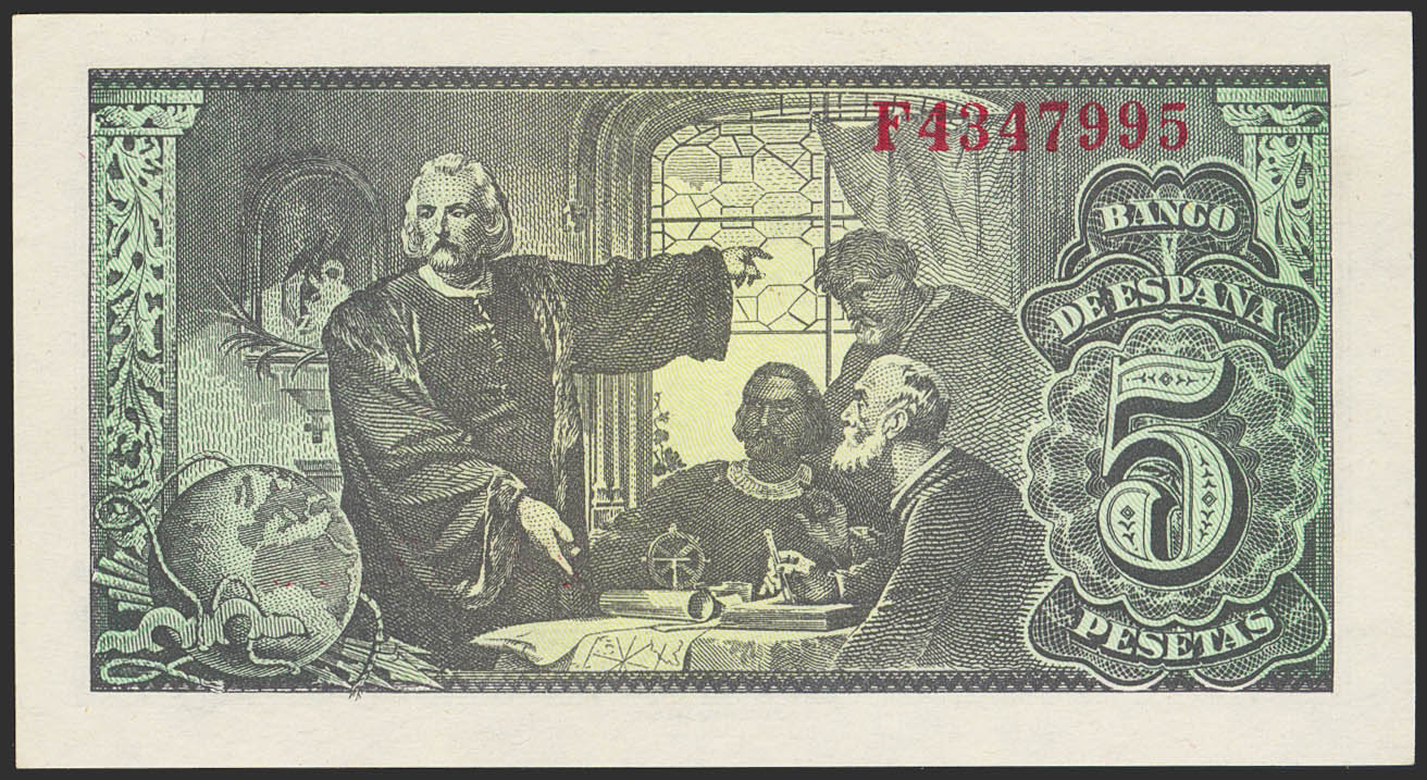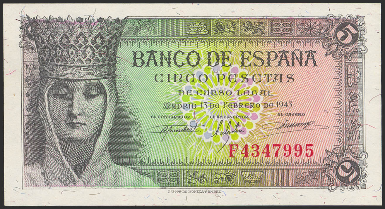 5 Pesetas. 13 de Febrero de 1943. Serie F. (Edifil 2023: 446a). Apresto original. SC-.
