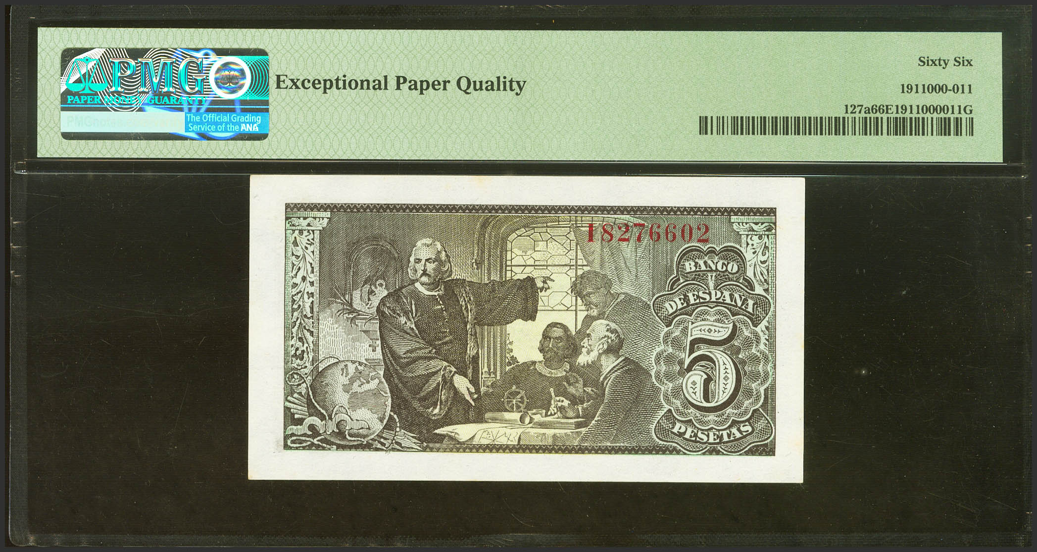5 Pesetas. 13 de Febrero de 1943. Serie I. (Edifil 2023: 446a, Pick: 127a). Apresto original. SC. Encapsulado PMG66EPQ.