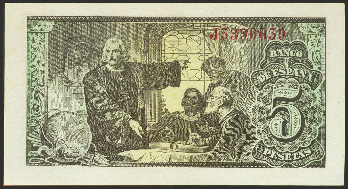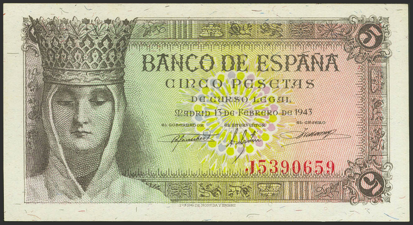 5 Pesetas. 13 de Febrero de 1943. Serie J, última serie emitida. (Edifil 2021: 446a). SC-.