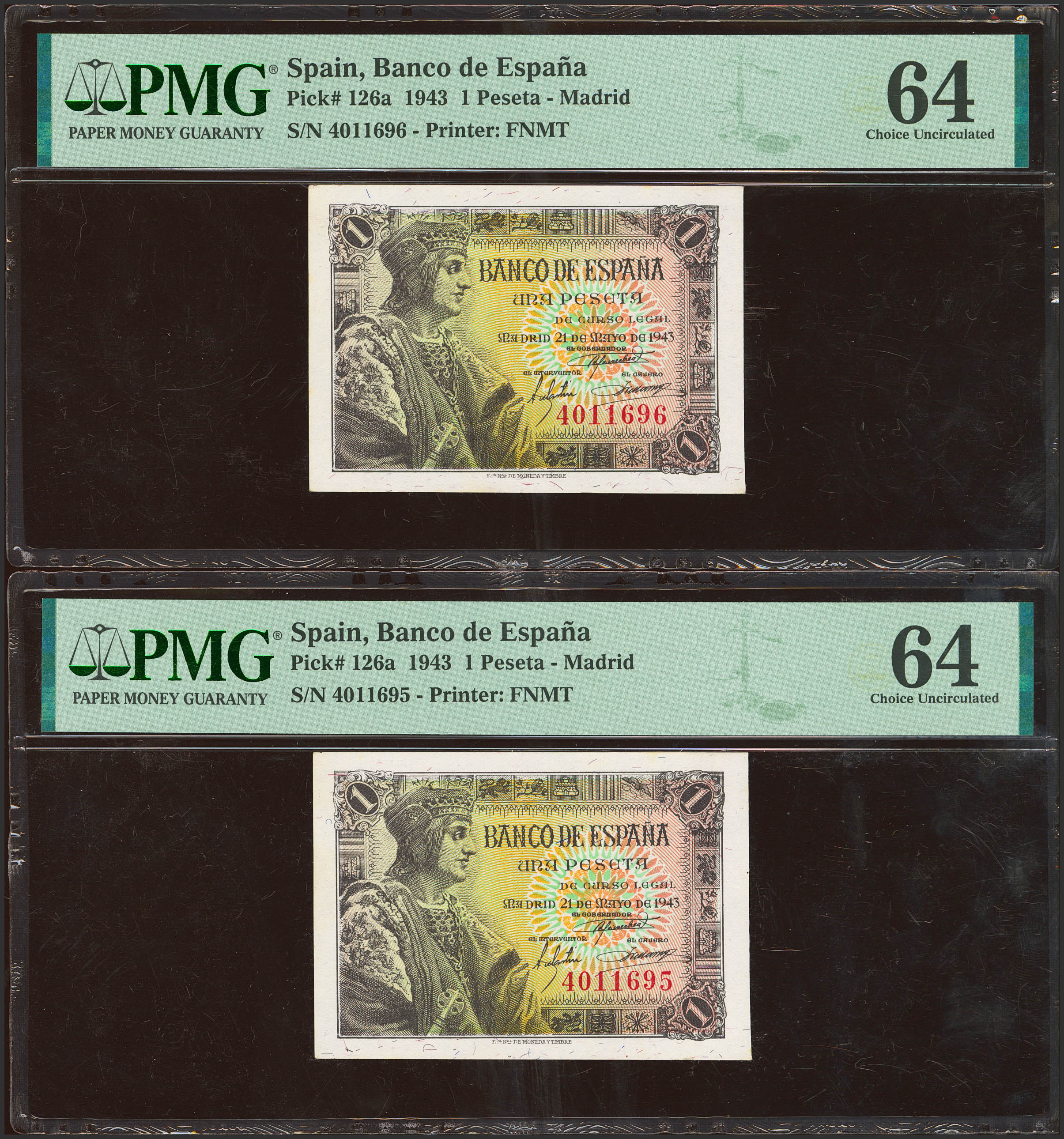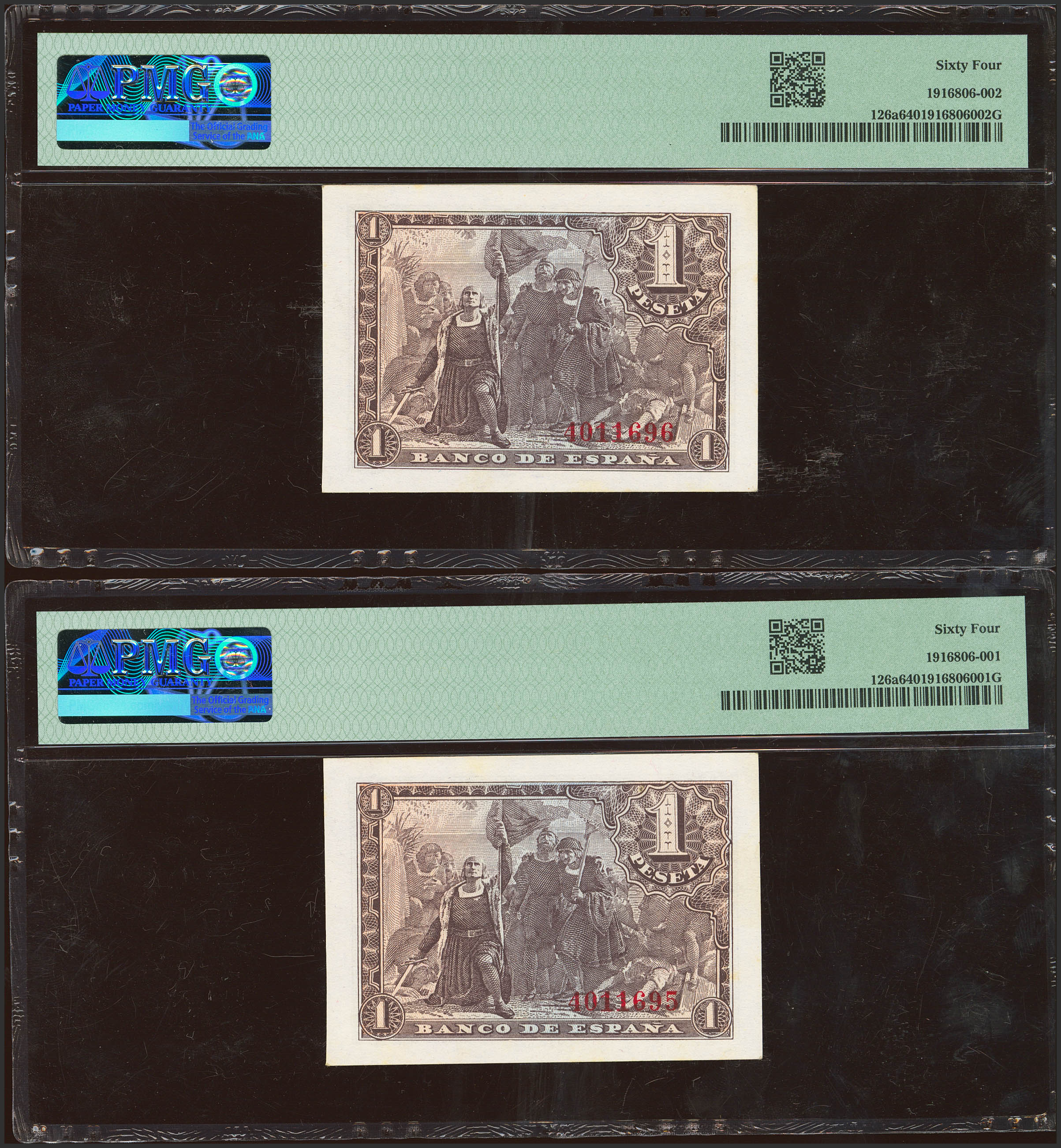 1 Peseta. 21 de Mayo de 1940. Pareja correlativa. Sin serie. (Edifil 2023: 447, Pick: 126a). SC. Encapsulados PMG64, ambos.