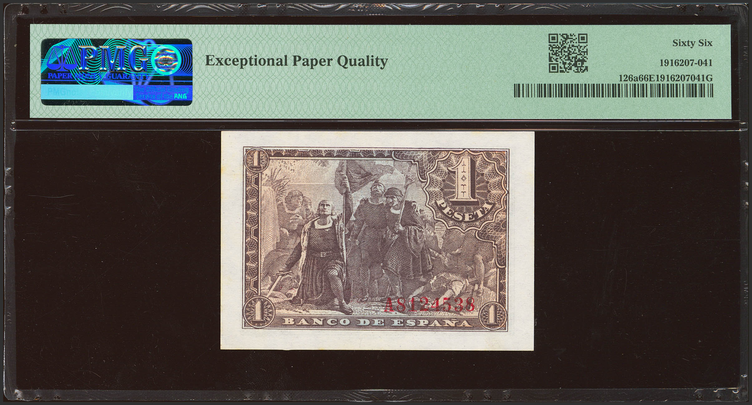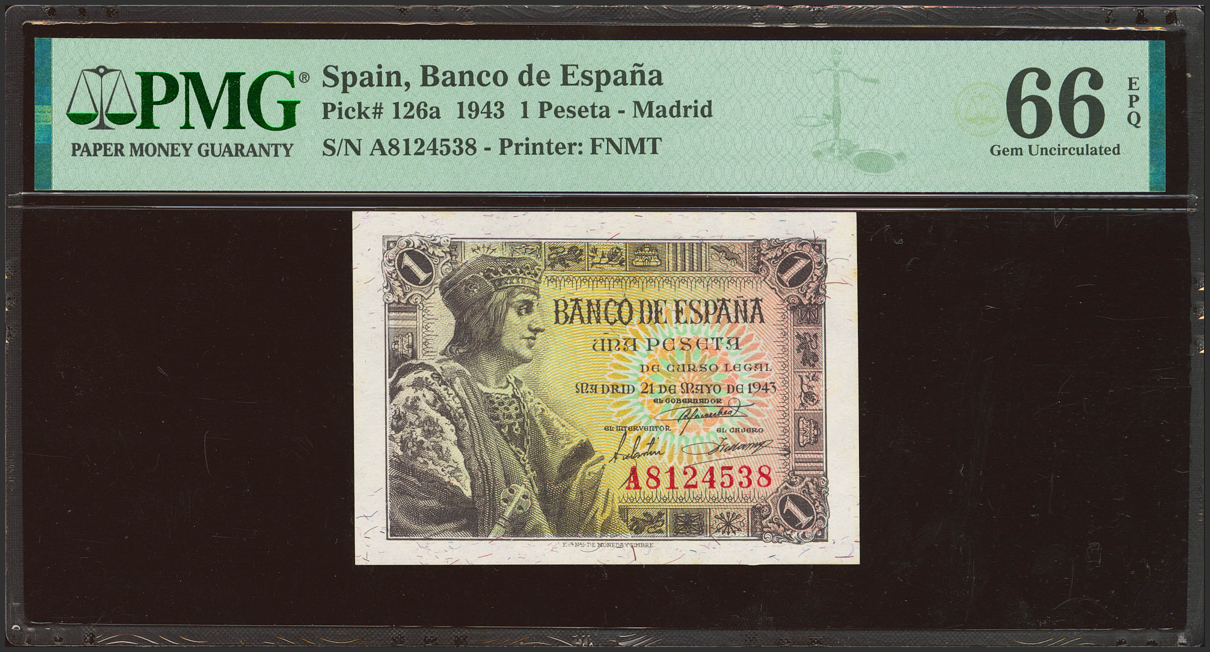 1 Peseta. 21 de Mayo de 1943. Serie A. (Edifil 2023: 447a, Pick: 126a). Apresto original. SC. Encapsulado PMG66EPQ.