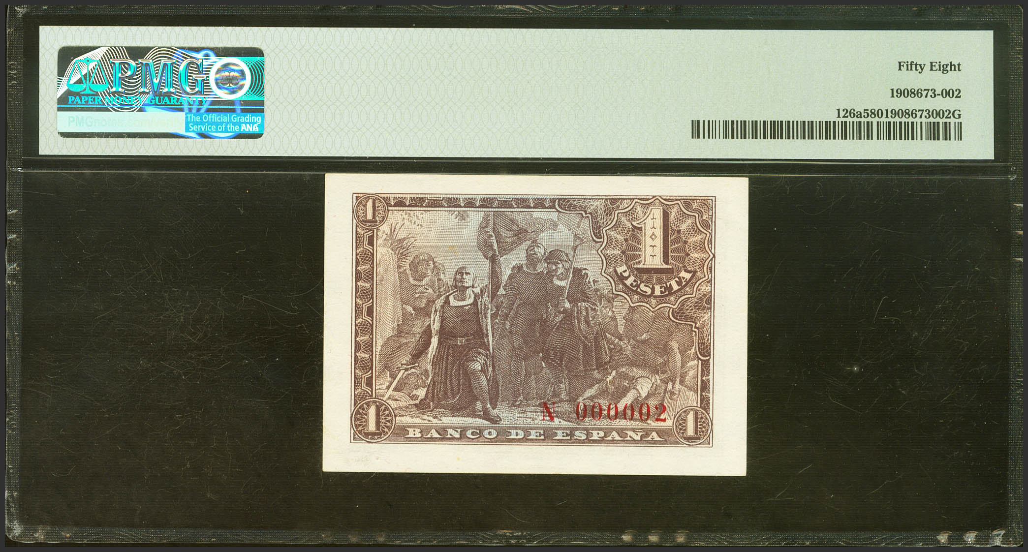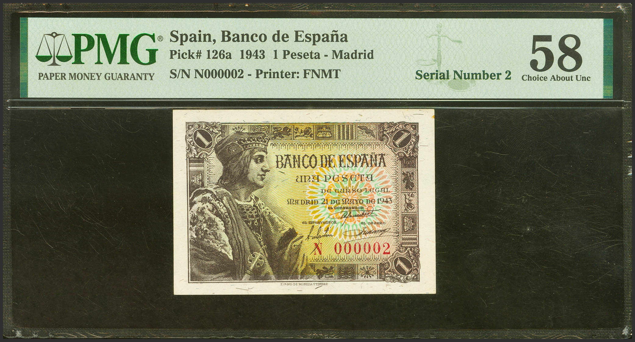 1 Peseta. 21 de Mayo de 1943. Serie N, última serie emitida y numeración bajísima (Nº000002). (Edifil 2023: 447b, Pick: 126a). Rarísima numeración tan baja. EBC++. Encapsulado PMG58.