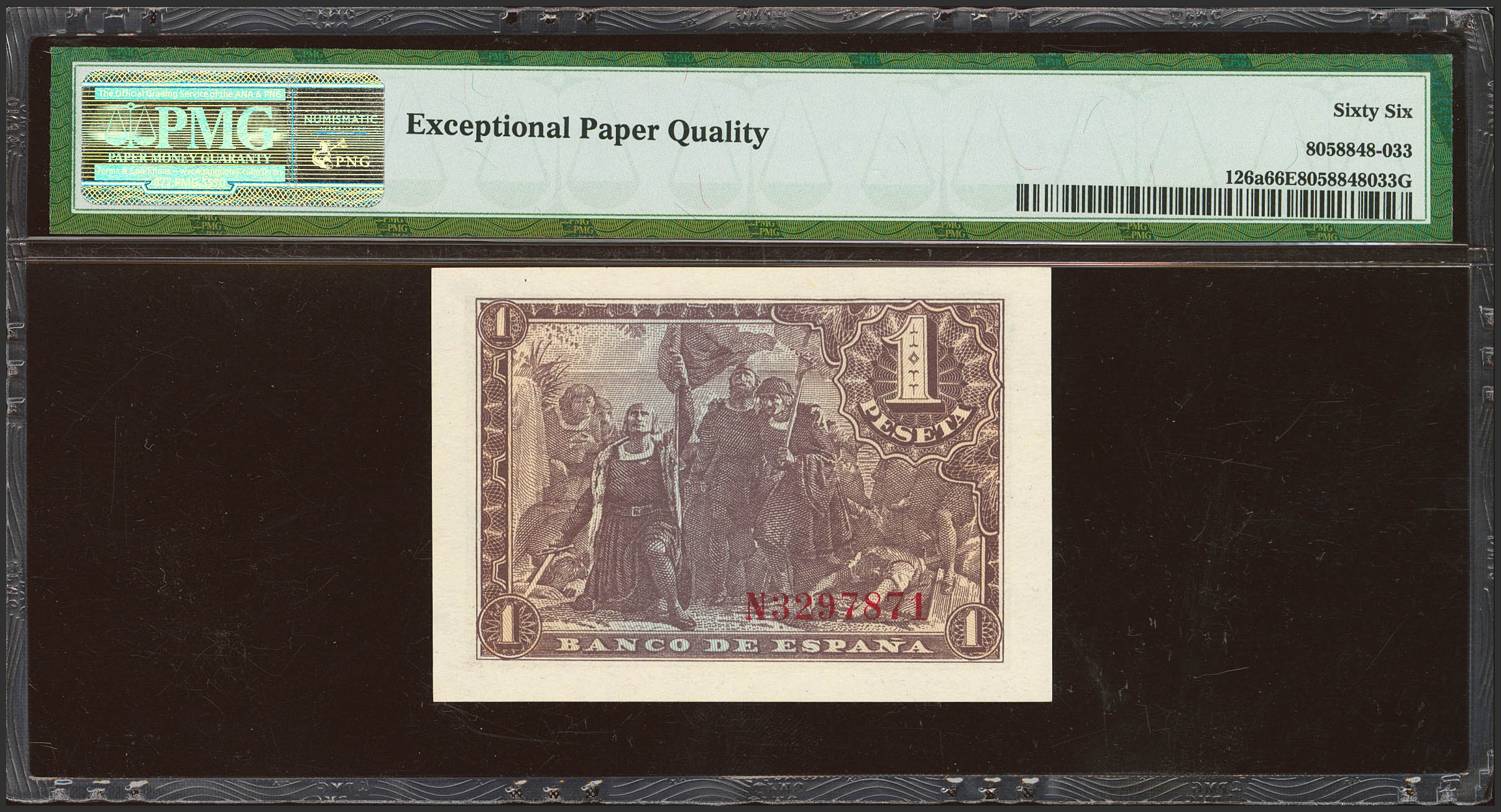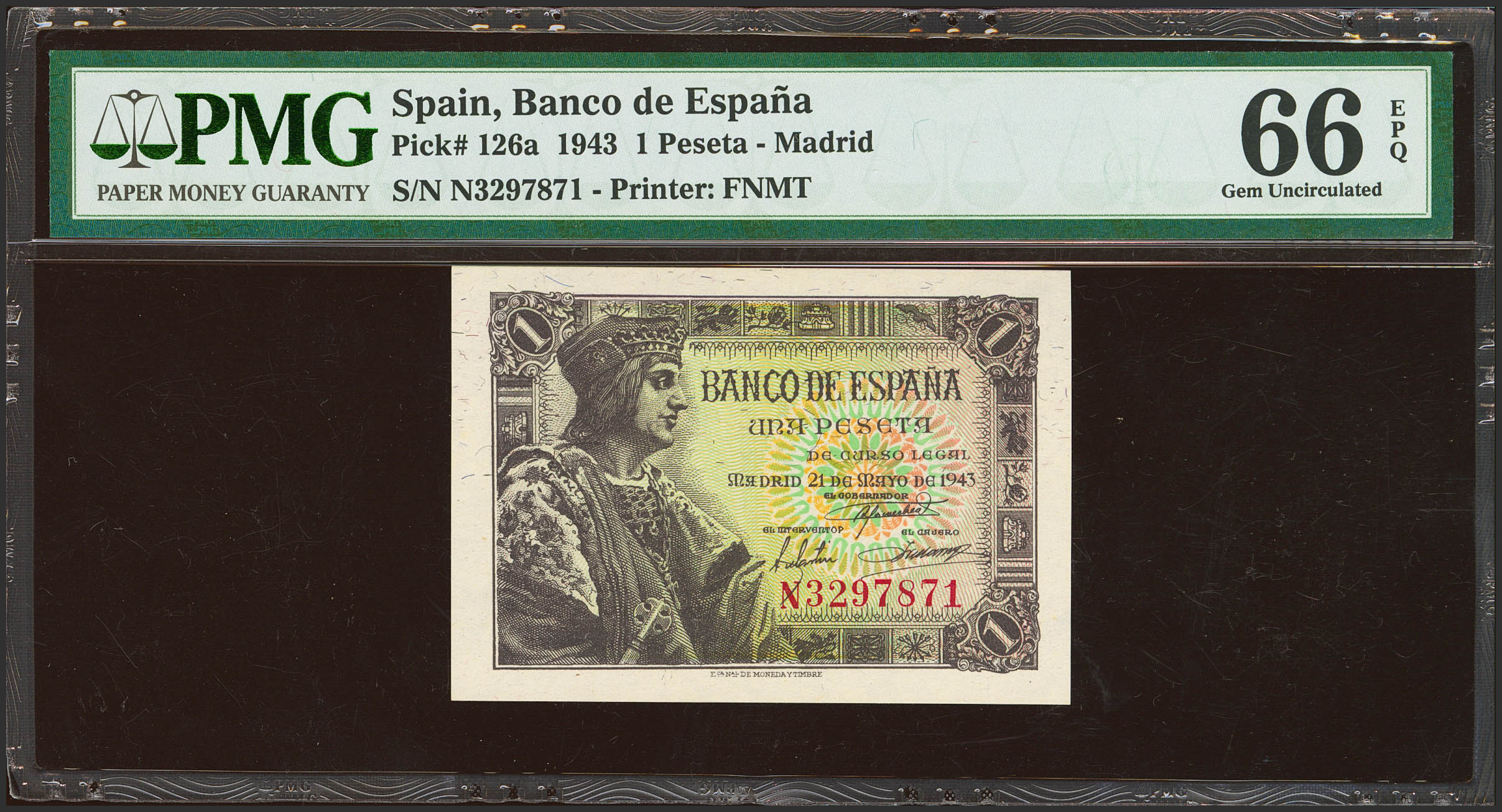1 Peseta. 21 de Mayo de 1943. Serie N, última serie emitida. (Edifil 2023: 447b, Pick: 126a). Apresto original. SC. Encapsulado PMG66EPQ.