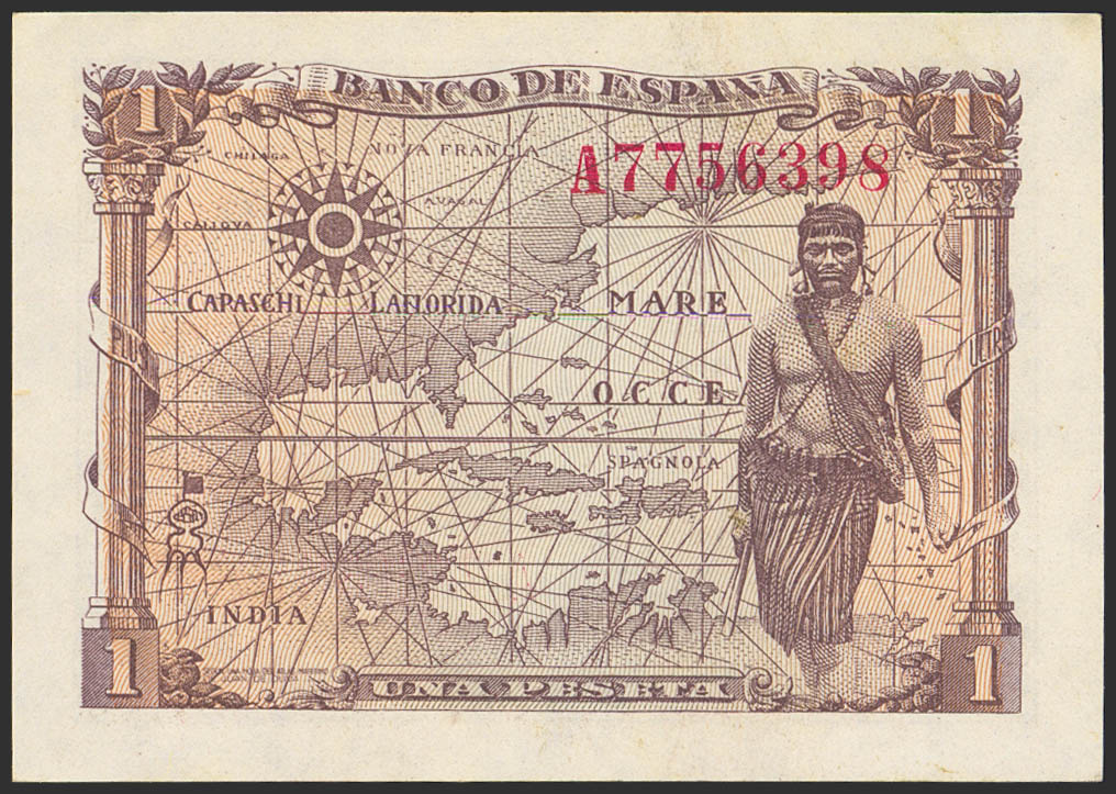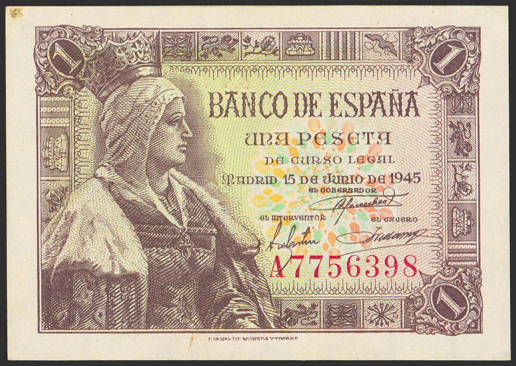 1 Peseta. 15 de Junio de 1945. Serie A. (Edifil 2023: 448a). Apresto original, manchita del tiempo en la esquina superior izquierda. SC-.