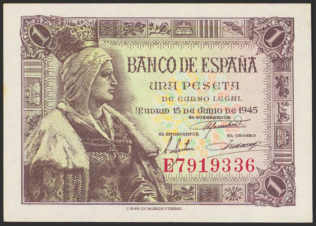 1 Peseta. 15 de Junio de 1945. Serie E. (Edifil 2023: 448a). Apresto original. SC-.
