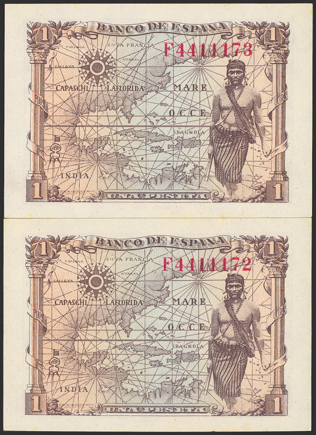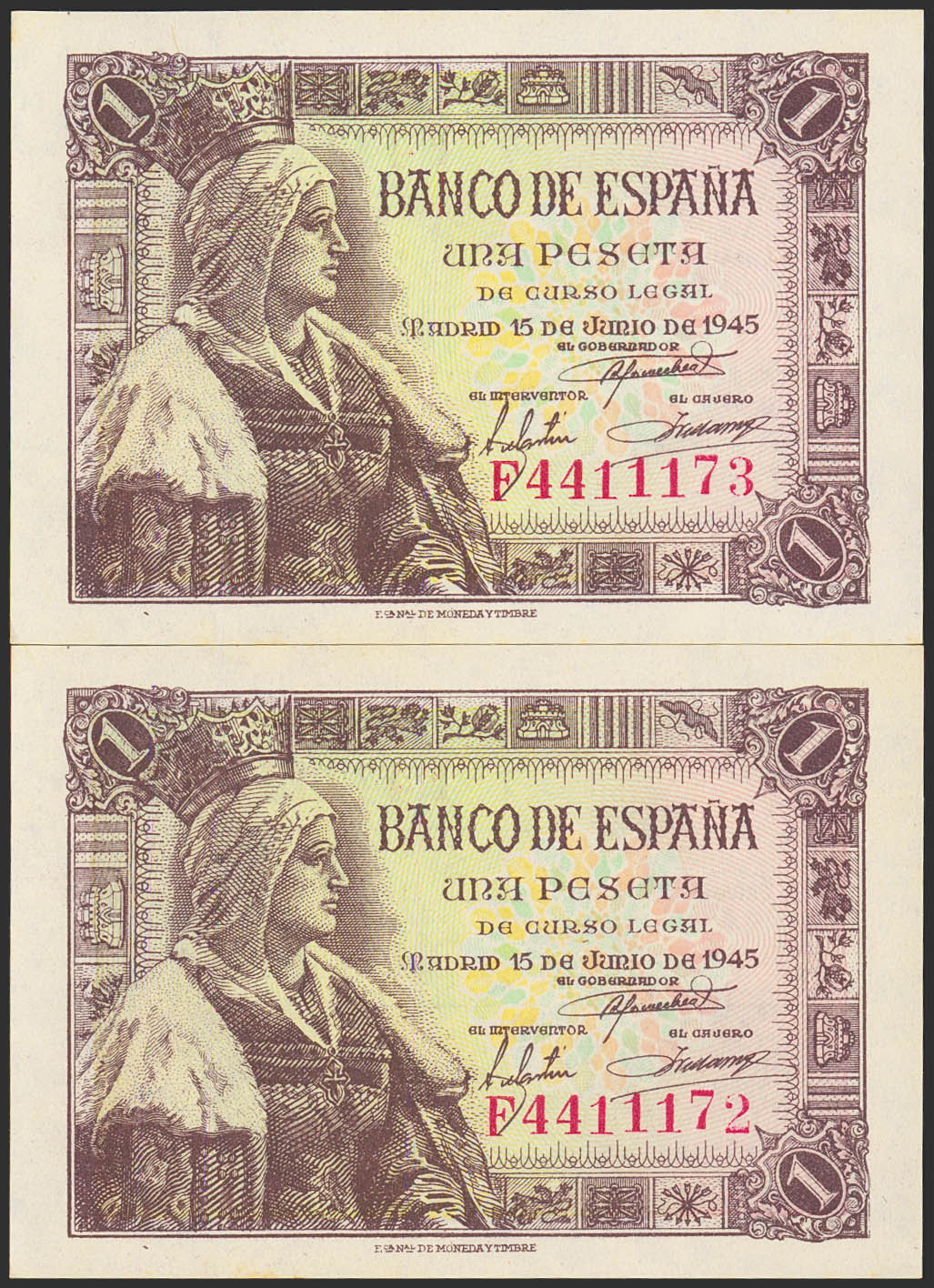 1 Peseta. 15 de Junio de 1945. Pareja correlativa. Serie F. (Edifil 2023: 448a). Apresto original. SC.