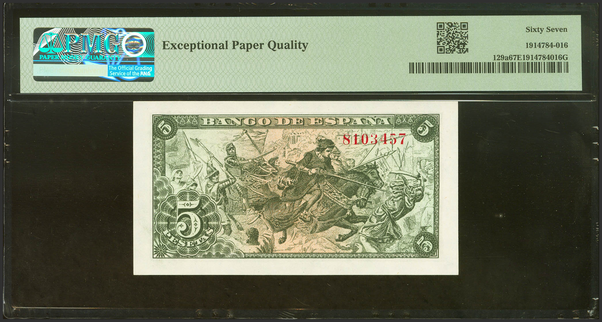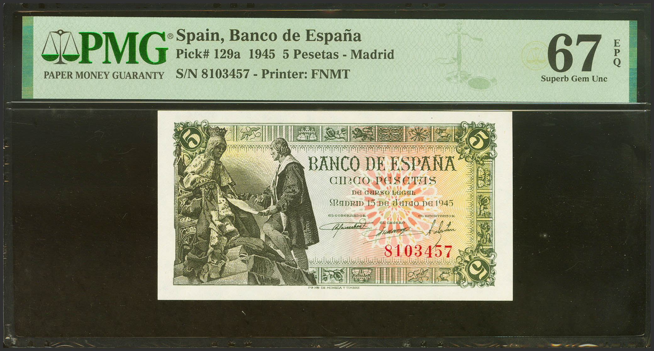 5 Pesetas. 15 de Junio de 1945. Sin serie. (Edifil 2023: 449, Pick: 129a). Raro en esta calidad, apresto original. SC. Encapsulado PMG67EPQ.