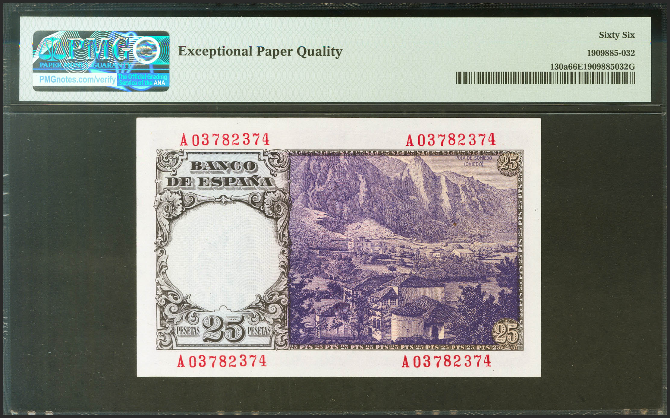 25 Pesetas. 20 de Febrero de 1946. Serie A. (Edifil 2021: 450a, Pick: 130a). Raro en esta excepcional calidad, apresto original. SC. Encapsulado PMG66EPQ.