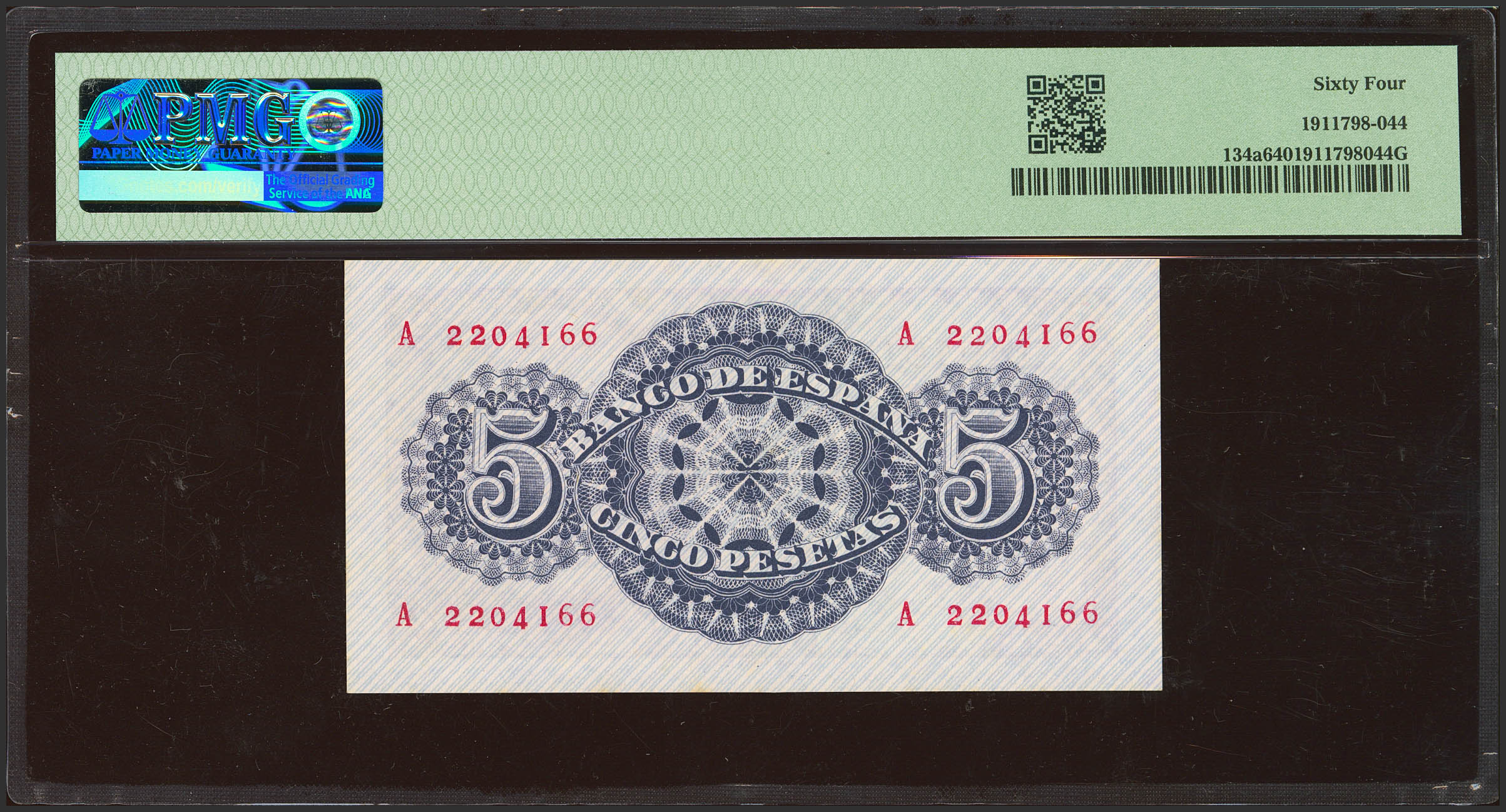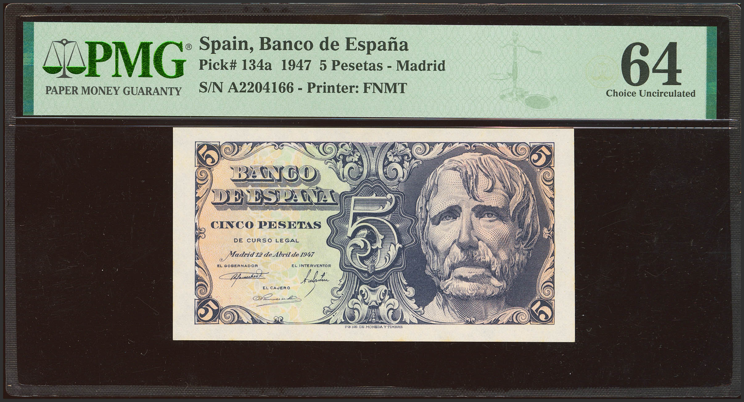 5 Pesetas. 12 de Abril de 1947. Serie A. (Edifil 2023: 454a, Pick: 134a). SC. Encapsulado PMG64.