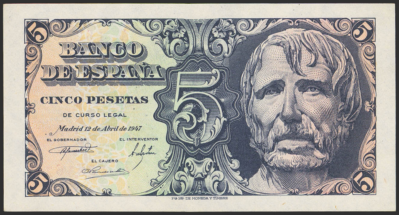 5 Pesetas. 12 de Abril de 1947. Serie A. (Edifil 2023: 454a). Conserva parte del apresto original. SC-.