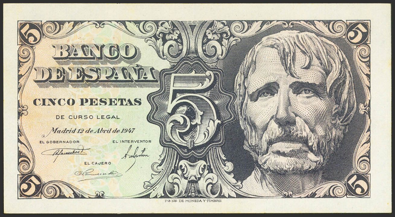 5 Pesetas. 12 de Abril de 1947. Serie C. (Edifil 2021: 454a). Conserva parte del apresto original. SC-.