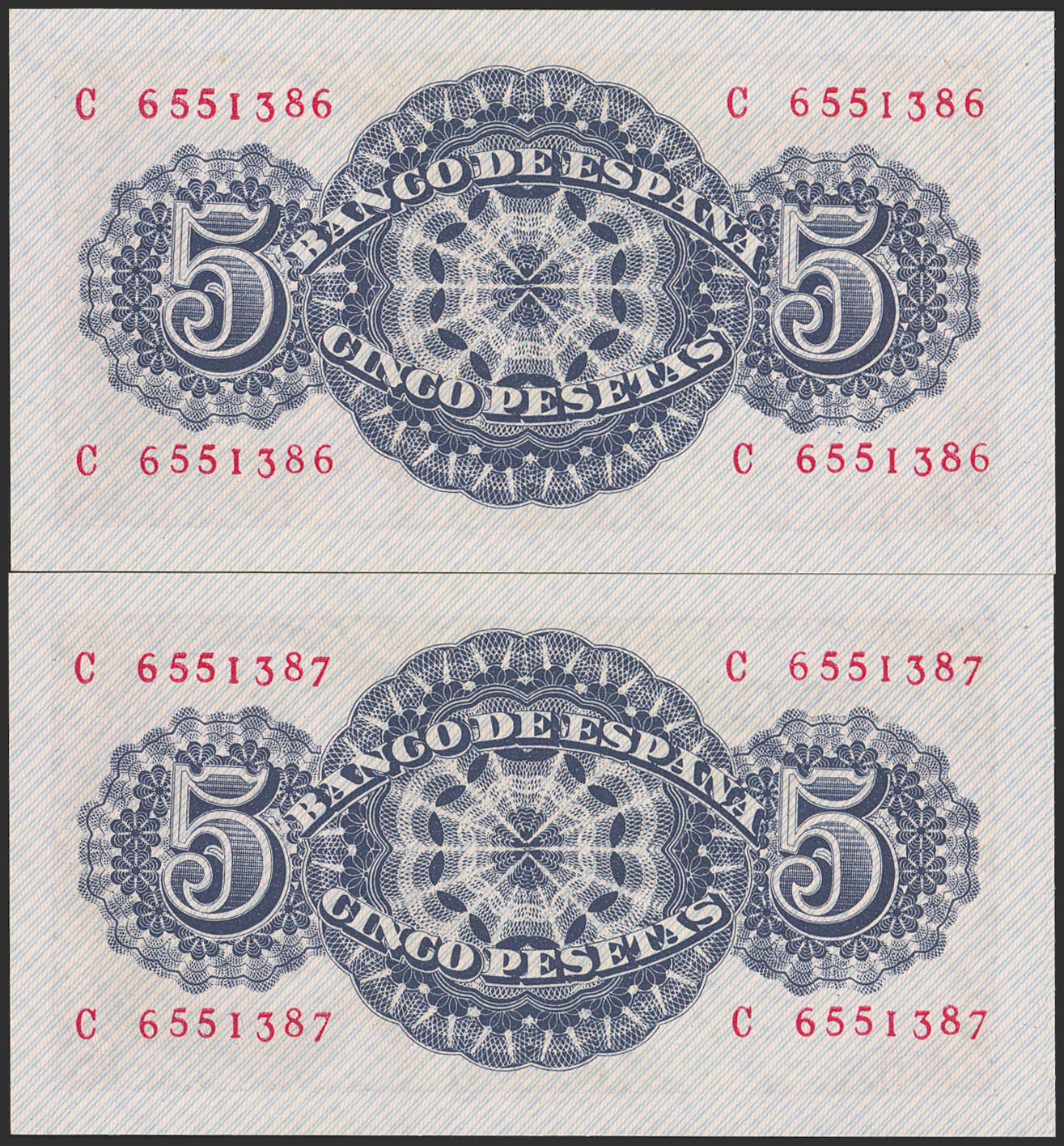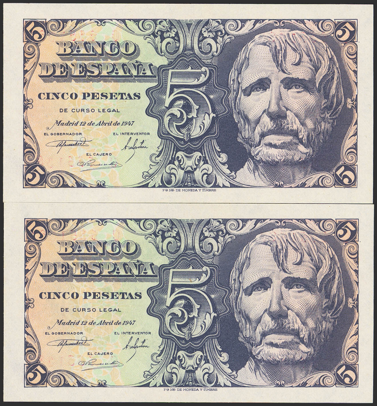 5 Pesetas. 12 de Abril de 1947. Pareja correlativa. Serie C. (Edifil 2023: 454a). Conserva todo su apresto original. SC.