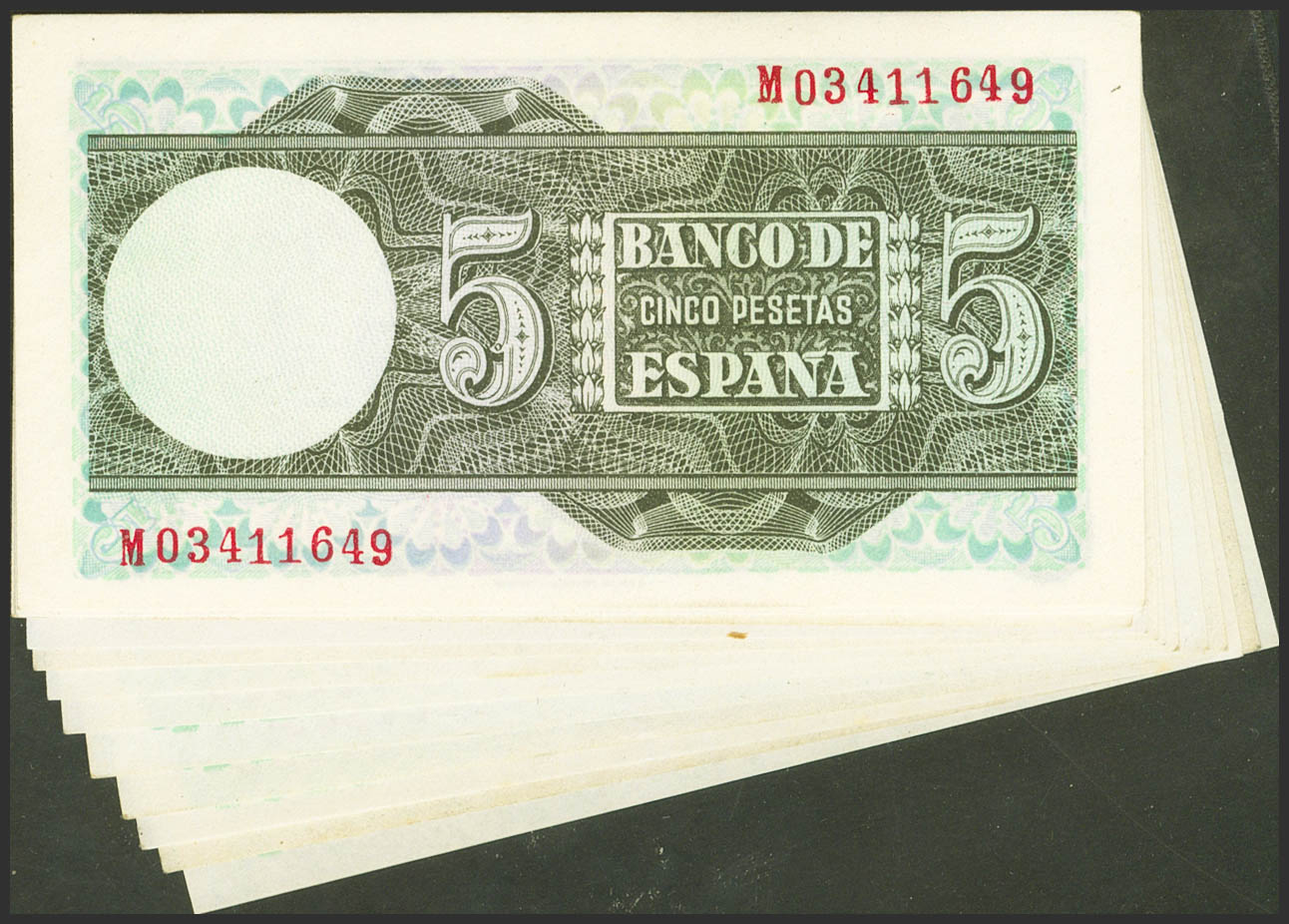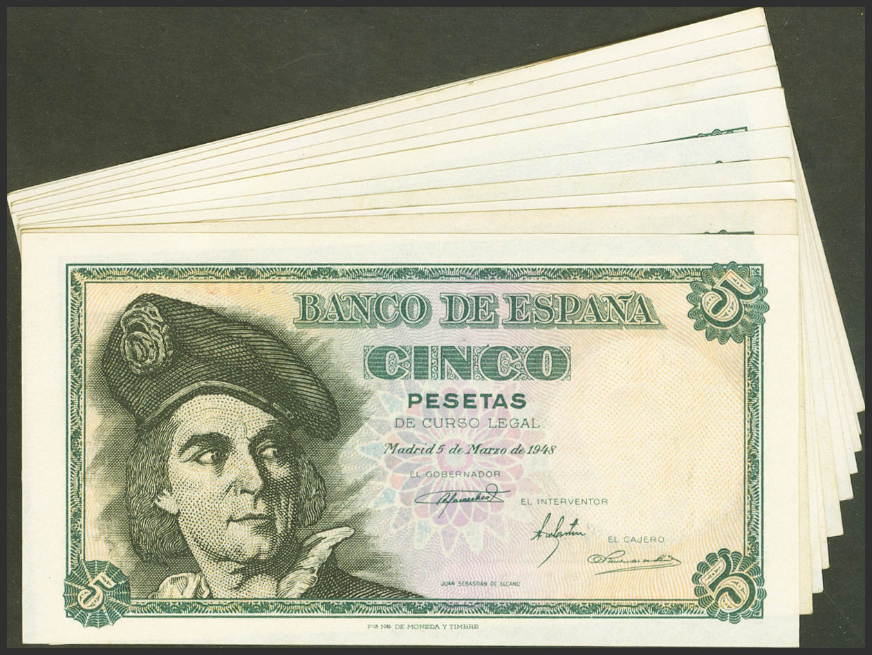 Conjunto de 12 billetes de 5 Pesetas emitidos el 5 de Marzo de 1948, incluyendo todas las series emitidas a falta del sin serie, la serie G y N. (Edifil 2021: 455a), conserva apresto original. SC/SC-.