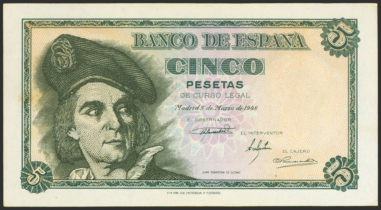 5 Pesetas. 5 de Marzo de 1948. Sin serie. (Edifil 2021: 455). Apresto original. SC-.
