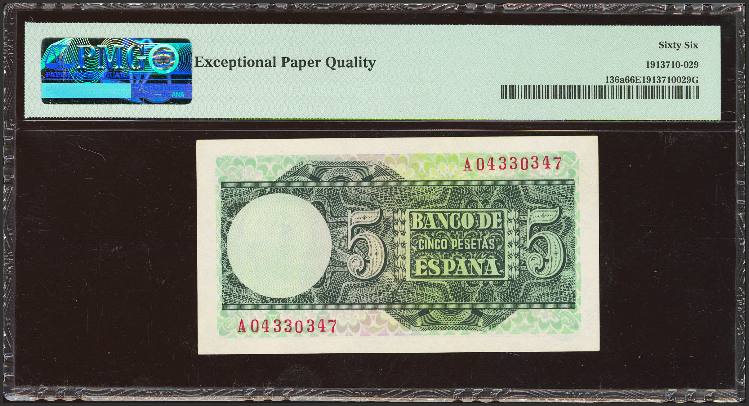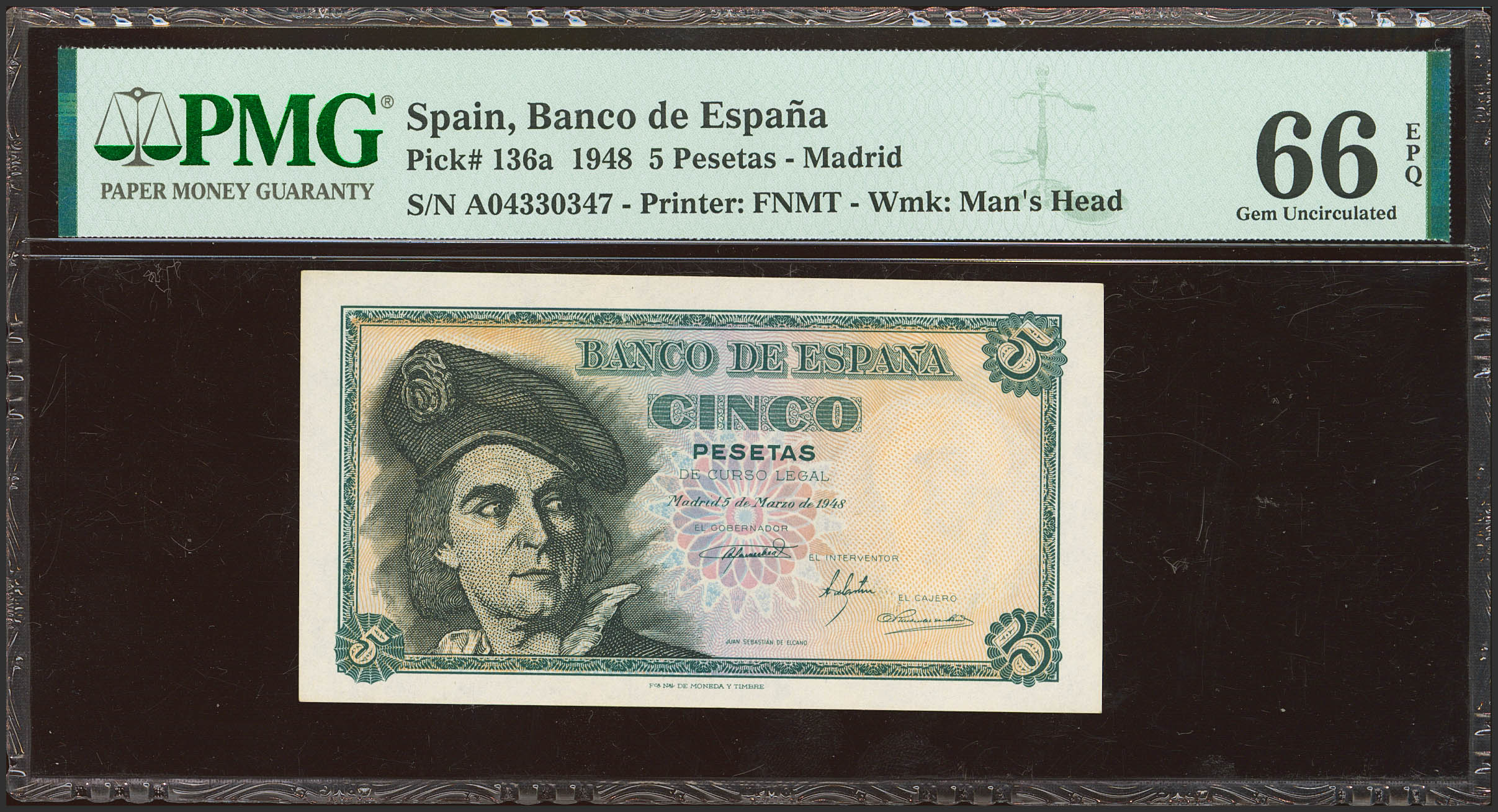 5 Pesetas. 15 de Marzo de 1948. Serie A. (Edifil 2023: 455a, Pick: 136a). Apresto original. SC. Encapsulado PMG66EPQ.