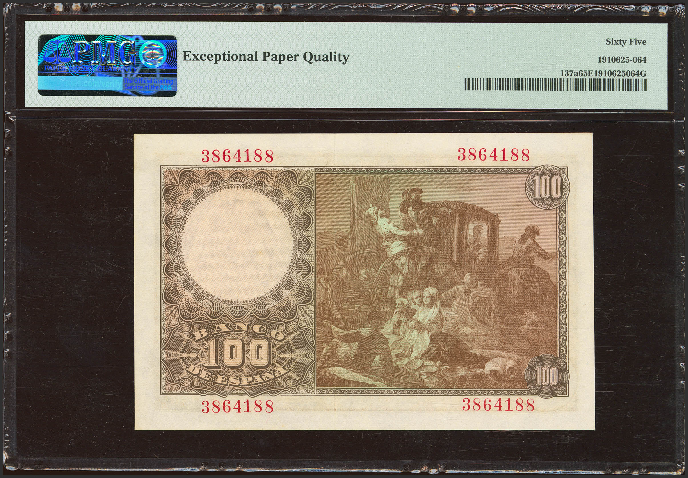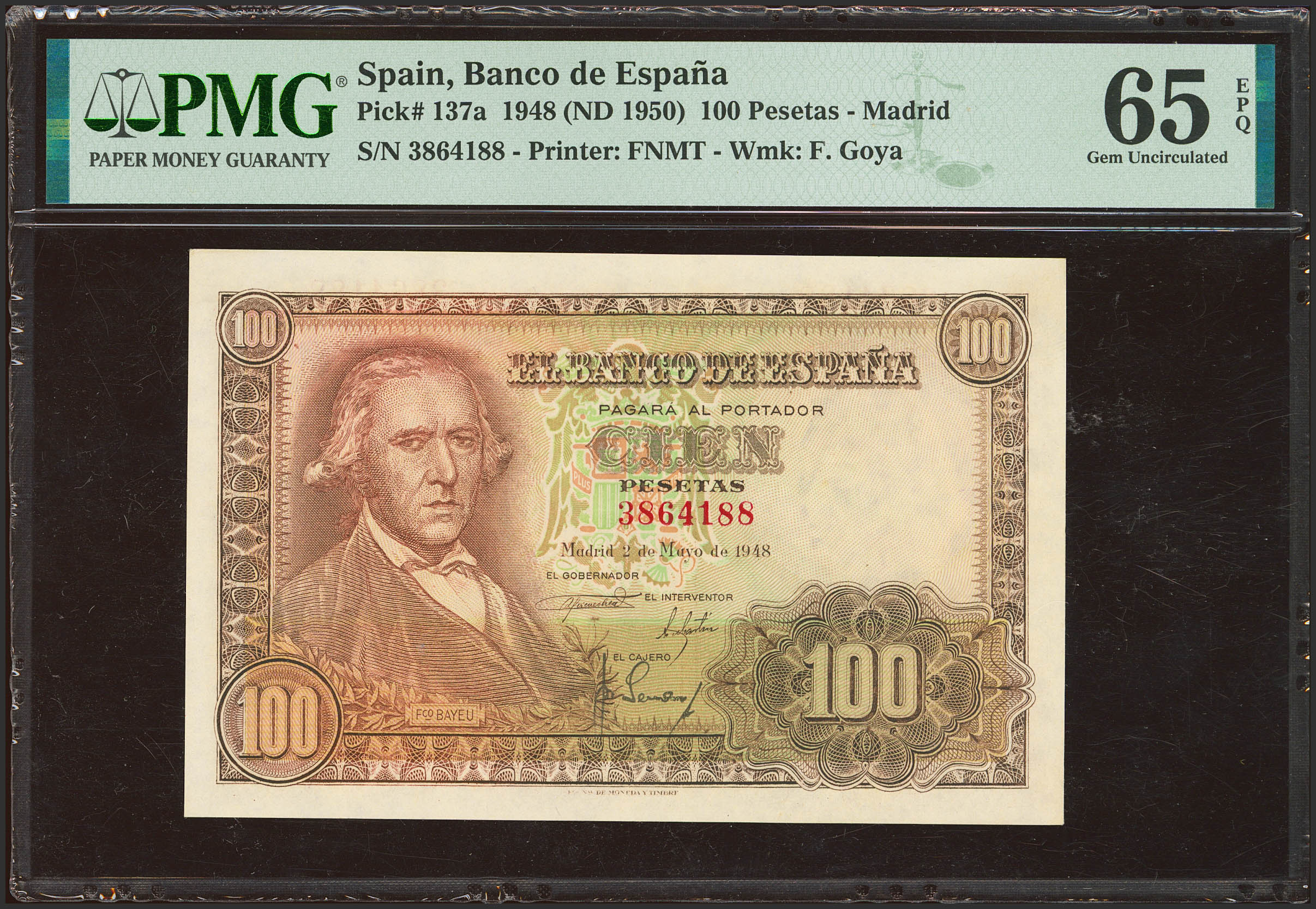 100 Pesetas. 2 de Mayo de 1948. Sin serie. (Edifil 2023: 456, Pick: 137a). Inusual en esta excepcional calidad, apresto original. SC. Encapsulado PMG65EPQ.