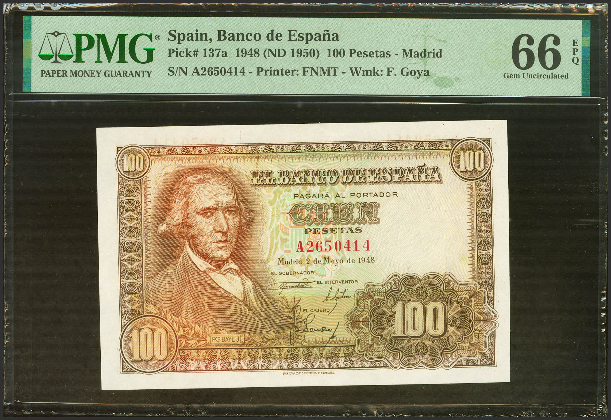 100 Pesetas. 2 de Mayo de 1948. Serie A. (Edifil 2023: 456a, Pick: 137a). Inusual en esta excepcional calidad, apresto original. SC. Encapsulado PMG66EPQ.