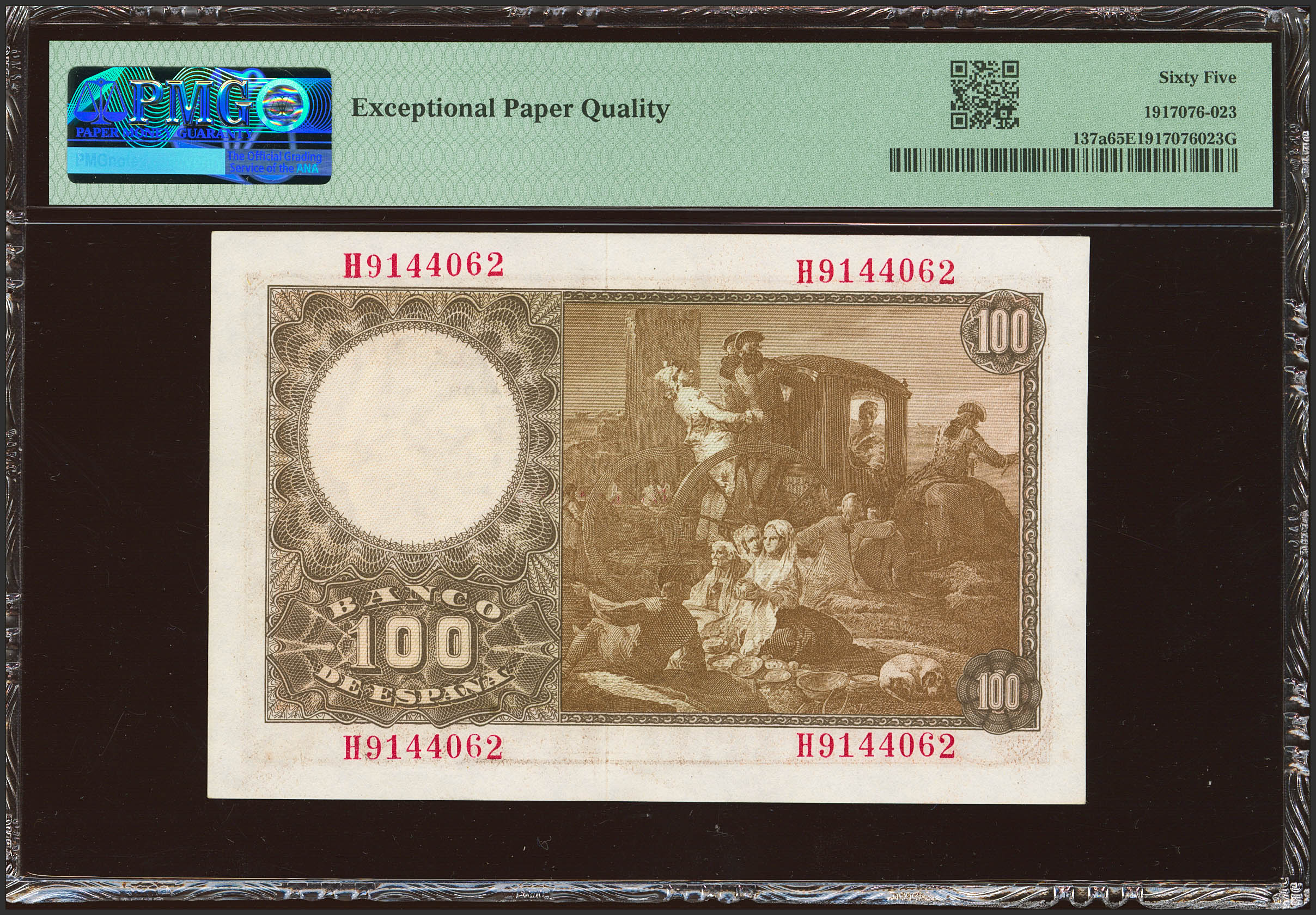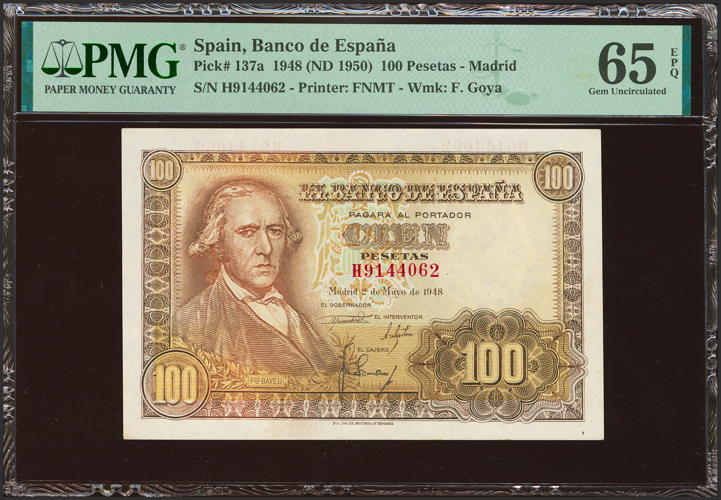 100 Pesetas. 2 de Mayo de 1948. Serie H. (Edifil 2021: 456a, Pick: 137a). Inusual en esta excepcional calidad, apresto original. SC. Encapsulado PMG65EPQ.