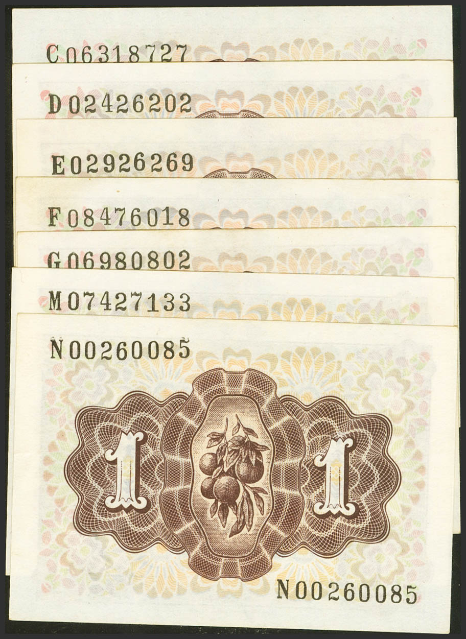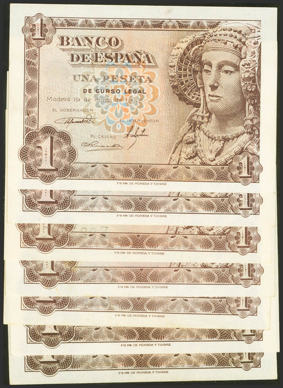 Conjunto de 7 billetes de 1 Peseta de 19 de Junio de 1948, con las series C, D, E, F, G (EBC), M y N, respectivamente (Edifil 2021: 457a), conservando su apresto original. SC/SC-.