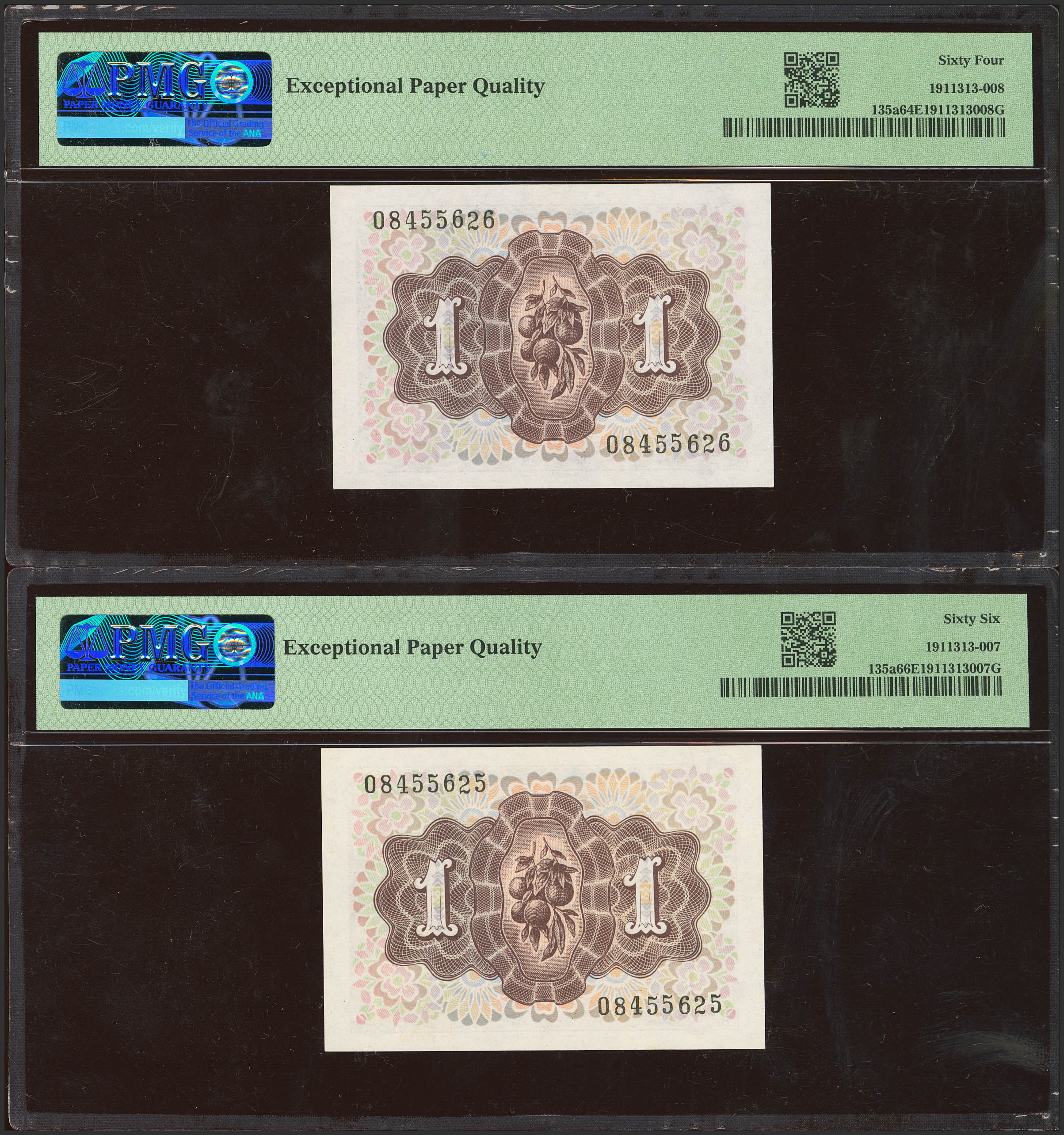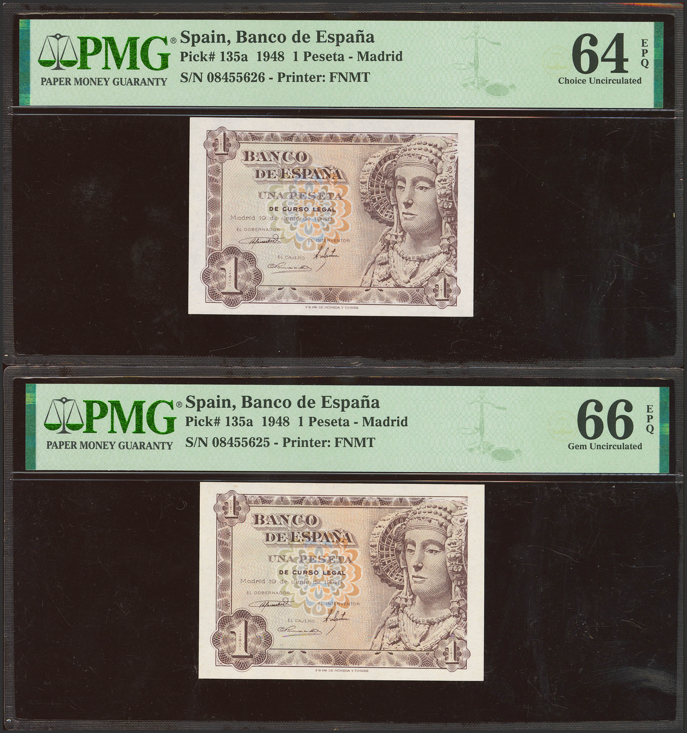 1 Peseta. 19 de Junio de 1948. Pareja correlativa. Sin serie. (Edifil 2023: 457, Pick: 135a). Apresto original. SC. Encapsulado PMG66EPQ/64EPQ.