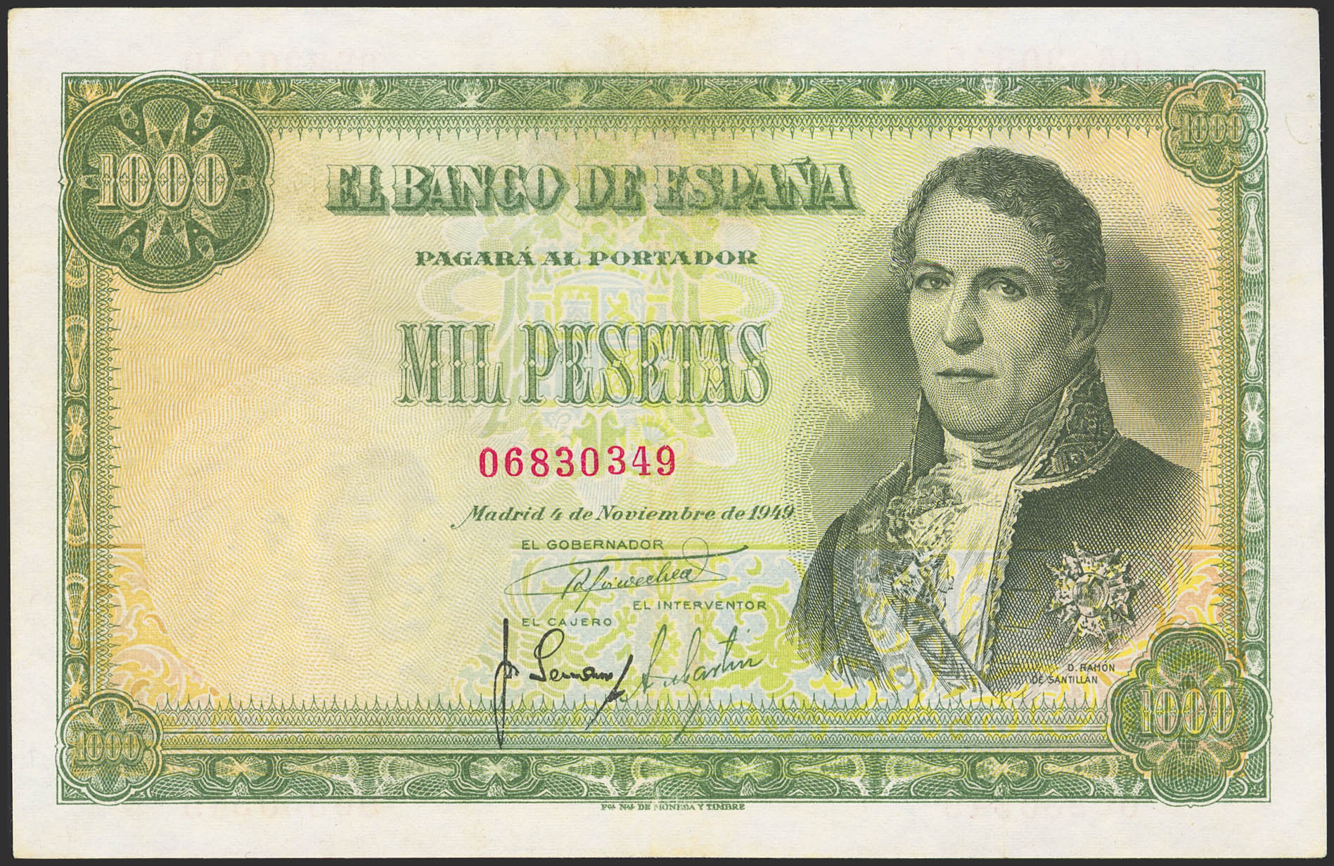 1000 Pesetas. 4 de Noviembre de 1949. Sin serie. (Edifil 2023: 458). Conserva parte del apresto original. EBC.
