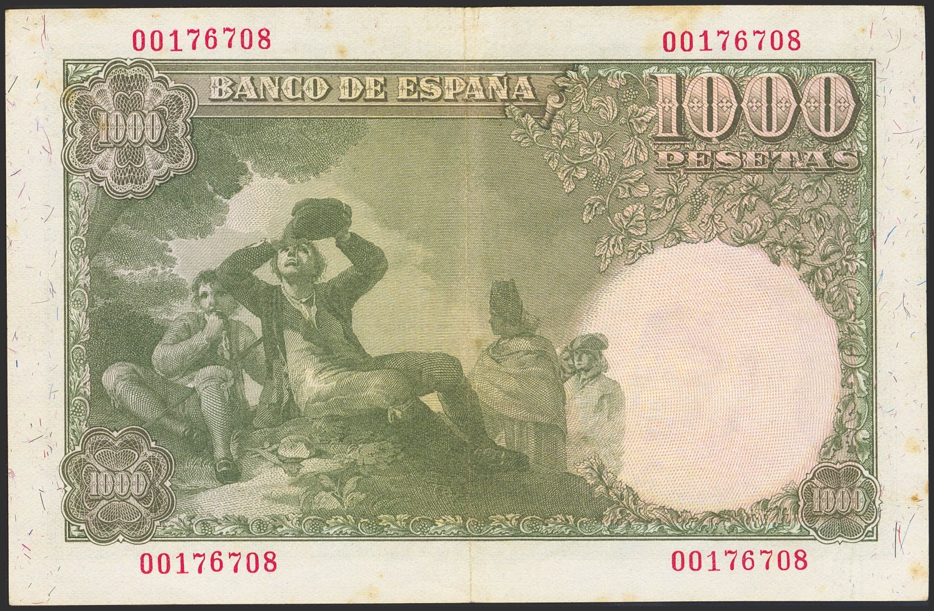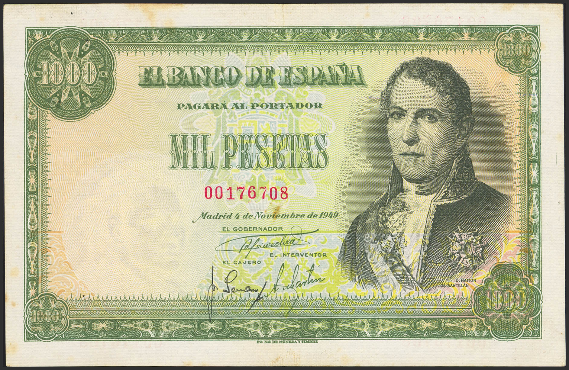 1000 Pesetas. 4 de Noviembre de 1949. Sin serie. (Edifil 2023: 458). Manchitas del tiempo. MBC.